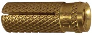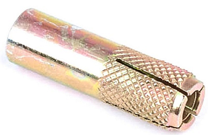 Анкер забивной - сделан из латуни, поэтому обеспечивает надежную эксплуатацию крепежного узла при высокой влажности воздуха. Крепеж представляет собой пустотелую втулку с внутренней резьбой. Нижняя часть изделия представляет собой цангу, разрезанную крестообразно в 4-х местах. За счет этого гильза анкера надежно прижимается к внутренним стенкам материала. На наружной поверхности крепежа двухрядная накатка, препятствующая проворачиванию крепежа при фиксации внутри отверстия в бетоне.