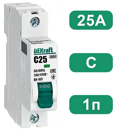 Автоматический выключатель для защиты цепей от тока перегрузки и короткого замыкания, цветовой указатель положения контактов, возможность использования доп.принадлежностей, диаметр присоединяемого проводника 1 - 25 кв.мм.