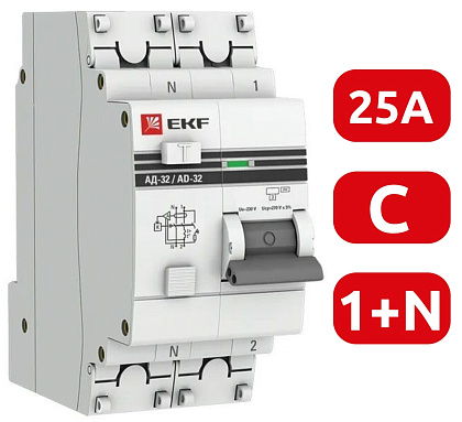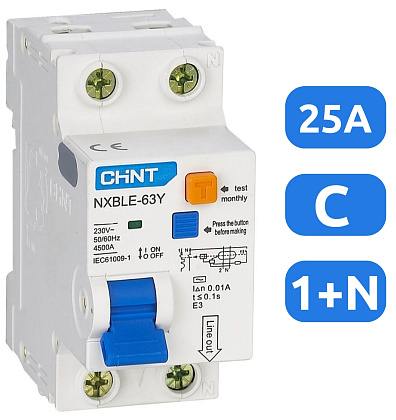 Характеристика срабатывания(кривая тока) — С , Номинальный ток — 25 А , Номинальный ток утечки - 0,03 А.