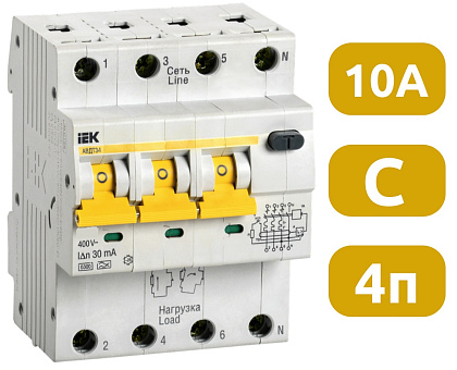 АВДТ34 выпускаются в четырехполюсном исполнении на номинальные токи 6, 10, 16, 25, 32, 40, 50, 63 А и номинальные отключающие дифференциальные токи 10, 30, 100, 300 мА.