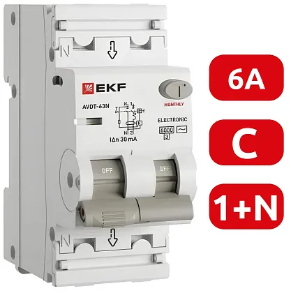 Автоматический выключатель дифференциального тока (АВДТ) S9D, серии Systeme9, Systeme Electric, 1P+N, номинальный ток 6 А, характеристика C, Icn = 6 кА, ток утечки = 30 мА, тип AC. Соответствует требованиям стандартов ГОСТ IEC 61009-1 и ГОСТ IEC 60947-2. Применяется в электрических сетях напряжением 230 В. Предназначен для защиты цепей от сверхтоков и для защиты людей от токов утечки при прямом (10 и 30мА) и косвенном (100мА) прикосновении к токоведущим частям, а также для защиты электроустановок от возгорания (300мА). Принцип действия - электромеханический. Нейтраль слева. Оснащен двойными безопасными клеммами раздельного монтажа проводников, механизмом мгновенной коммутации, индикатором состояния контактной группы и раздельными индикаторами срабатывания по причине возникновения сверхтока или тока утечки. Монтируется на DIN-рейку при помощи двухпозиционных защёлок, с возможностью демонтажа без снятия шины PIN.