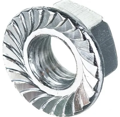 Гайка с фланцем DIN 6923 используется в соединениях с болтами, винтами и другим метрическим крепежом, применяется в соединениях, где требуется обеспечение высокого давления. Крепежный элемент, совмещающий в себе шестигранную гайку с одной стороны и зубчатый фланец (зубчатая плоская деталь круглой формы) — с другой. Распространён данный метиз в промышленном машиностроении, автомобильной промышленности, приборостроении и т.д. Другие названия этого метиза — гайка фланцевая, самостопорящаяся, с прессшайбой.