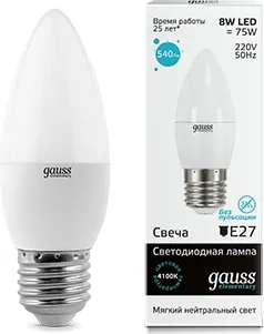 Энергосберегающая светодиодная лампа Gauss Elementary в форме свечи теплого свечения- отличный вариант для использования в любых типах помещений. Данный тип ламп пользуется огромной популярностью благодаря большому сроку службы при минимальном расходе электроэнергии. Лампа отличается безопасностью, при нагревании не выделяет токсичных веществ, не излучает вредных лучей. Цоколь Е27 подойдет для большинства бытовых светильников и люстр.