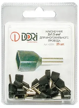 Оконцевание методом опрессовки гибких многопроволочных медных проводников сечением 2х1.5мм². Трансформирует концы многожильных проводов в монолитные штифты. Монтаж сдвоенных проводов одинакового сечения