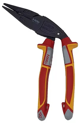 Для работы под напряжением до 1000 В Предназначены для работ в труднодоступных местах и в точной механике Захватные губки с зубцами и режущими кромками для среднетвердой и твердой проволоки Режущие кромки дополнительно закалены токами высокой частоты. HRC 62 Материал рабочей части: инструментальная хром-ванадиевая сталь Обработка поверхности: матовое никелирование Двухцветные многокомпонентные рукоятки с упорами для защиты от соскальзывания