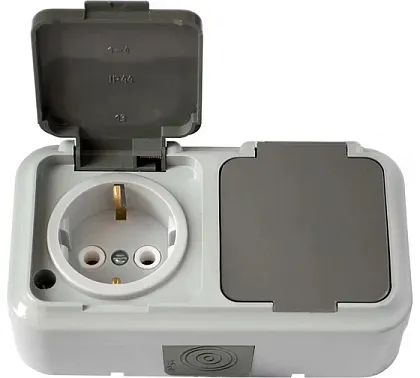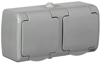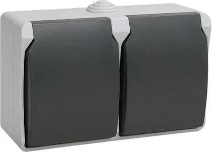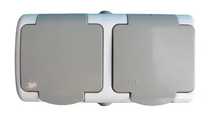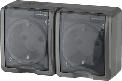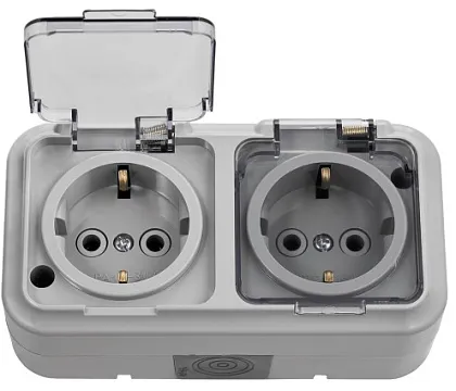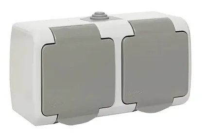 Штепсельная двухместная с заземляющим контактом, брызгозащищенная открытой установки.