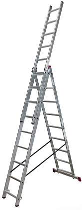 Универсальность данной лестницы заключается в том, что она может использоваться как раздвижная приставная лестница из трех частей и как свободностоящая стремянка (перевернутая русская буква «У»). Более того третья секция является съемной, и ею можно пользоваться отдельно как приставной лестницей, а оставшаяся часть при этом представляет двухсекционную универсальную лестницу. Эта лестница является по праву наиболее универсальной из всех лестниц, и несмотря на необходимый попарный перехлест секций как в конфигурации «приставная лестница» так и в конфигурации «стремянка», что усложняет, утяжеляет и поэтому удорожает ее, является самой популярной по продаваемости из-за своей исключительной универсальности.
