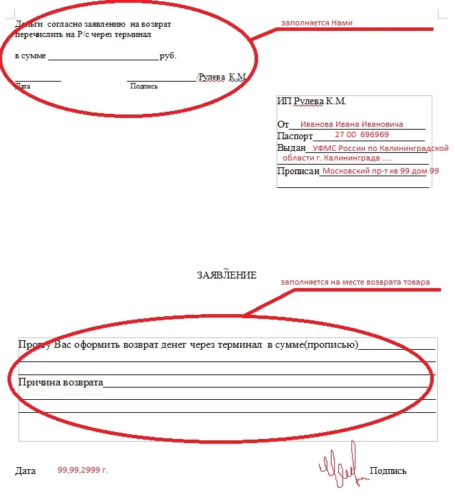 Если возврат будет осуществляться по банковской карте или наличными нужно иметь при себе:
