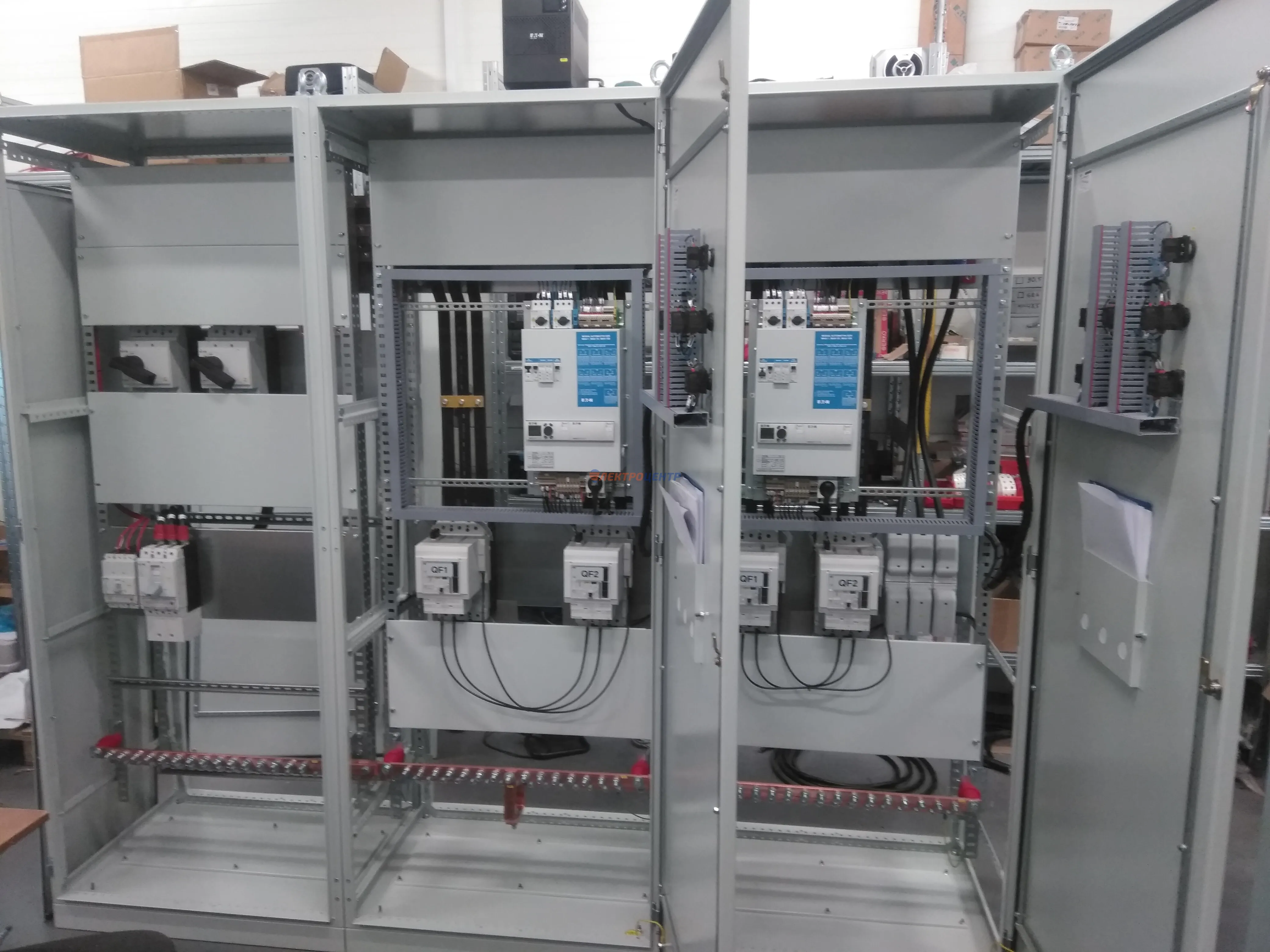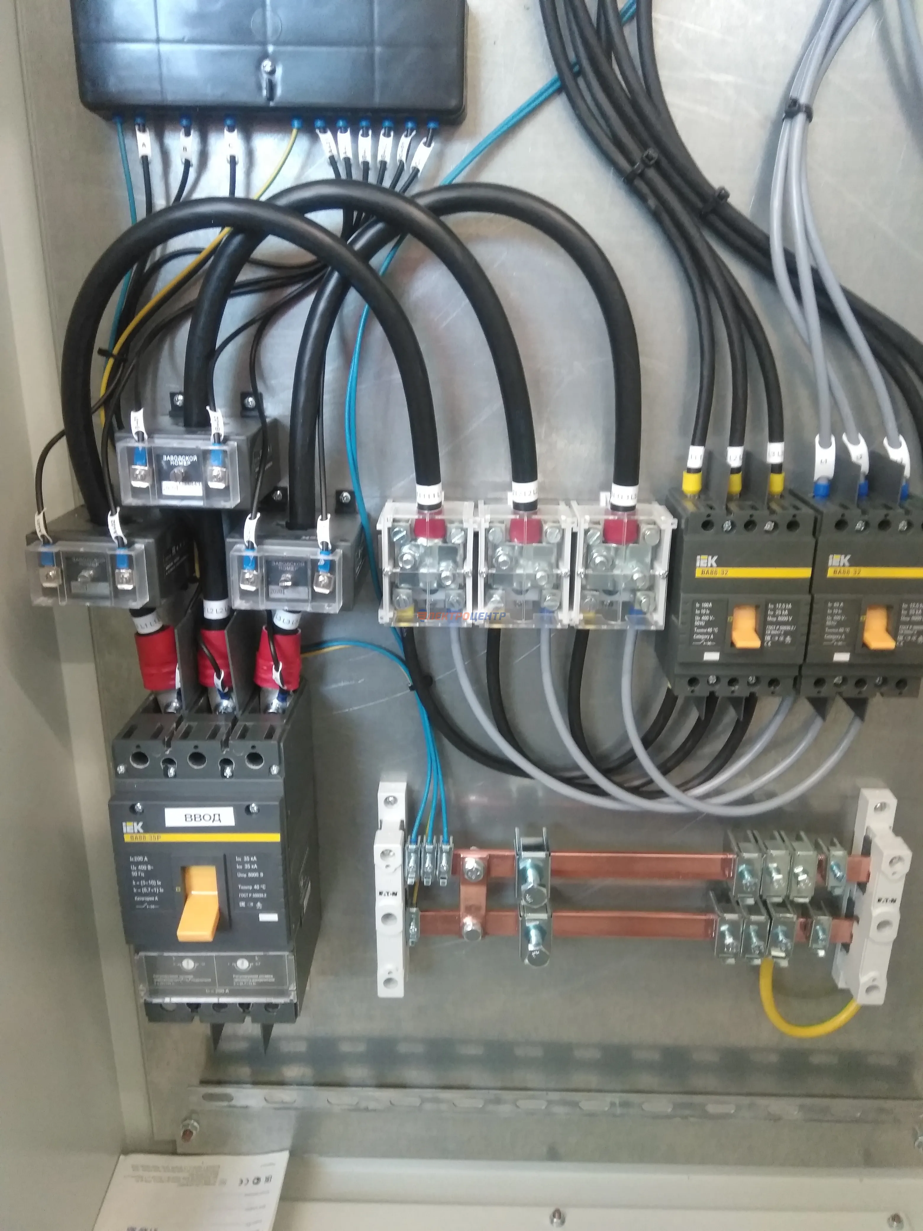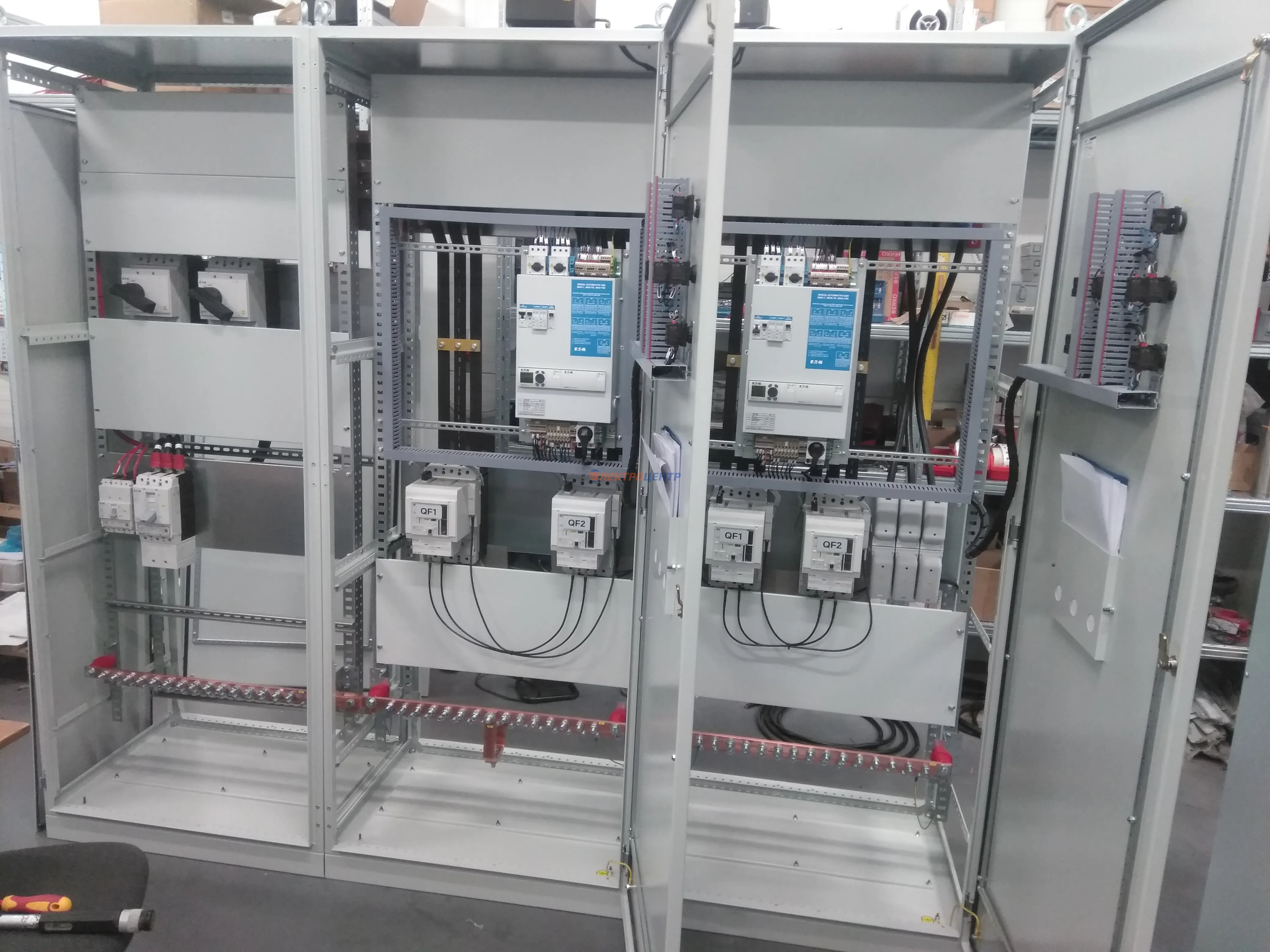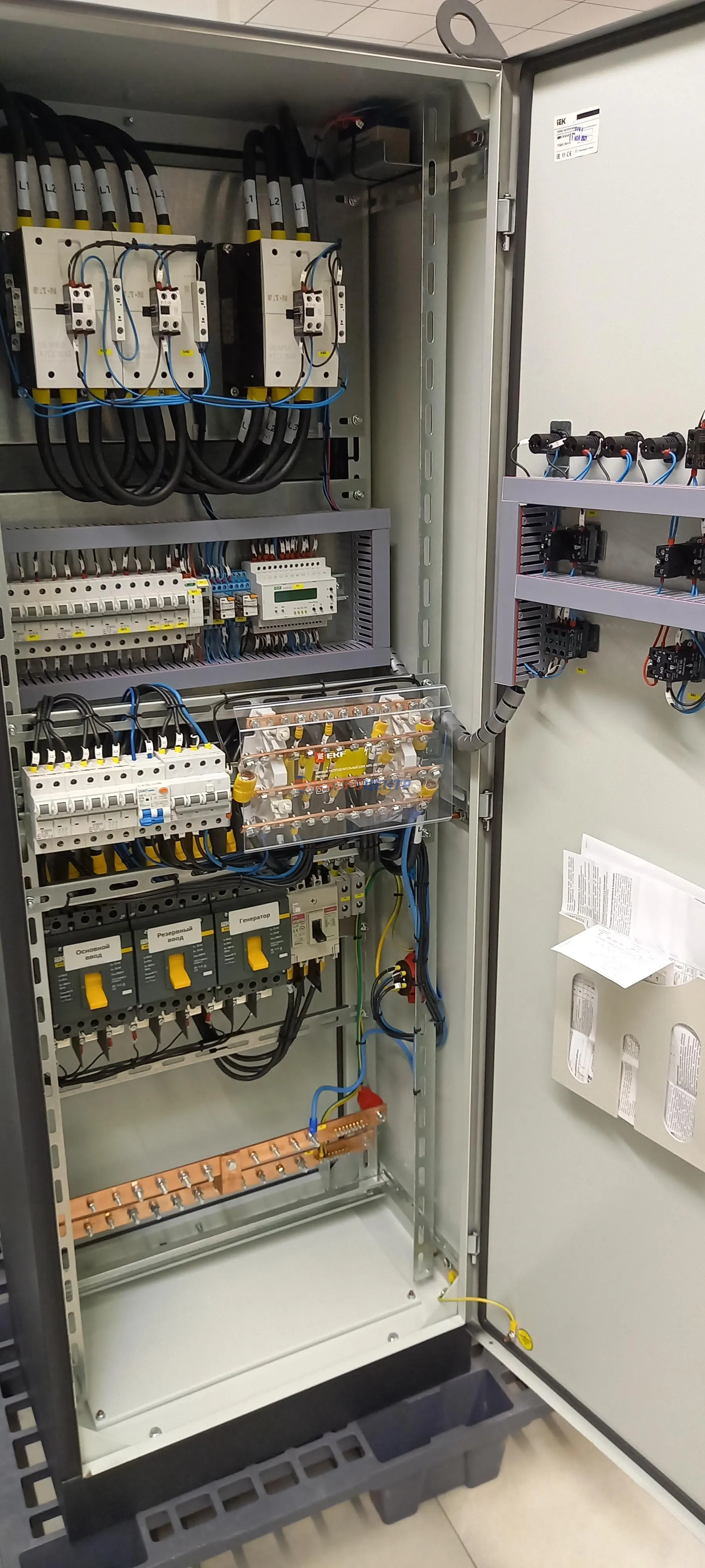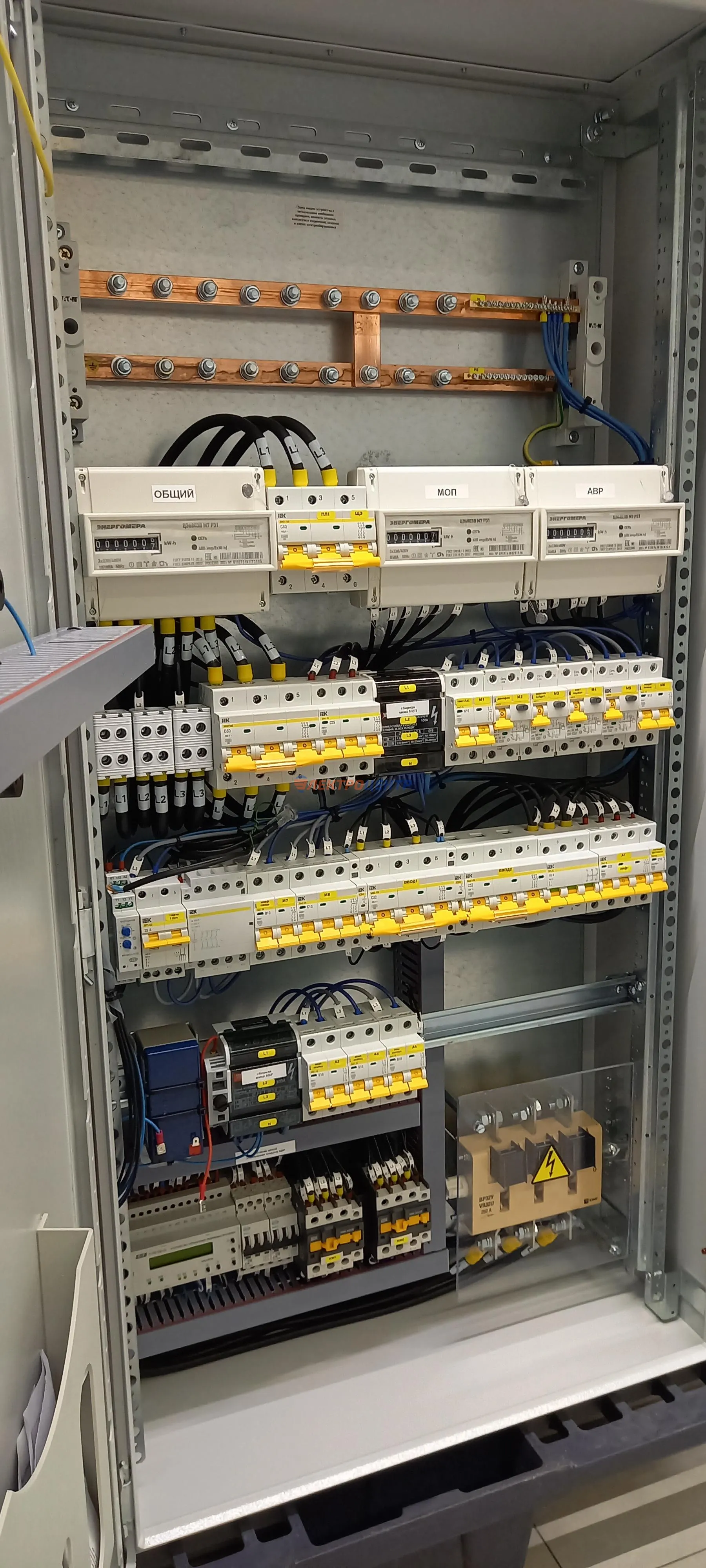 | 47 | ВРУ на 2500 А торгового центра в г. Калининград | «EATON”, “ETI”, “APATOR”, счётчики энергии ЭЛЬСТЕР МЕТРОНИКА, трансформаторы «FRER”, АВР типа MAX-3 «EATON” на 6 выключателей (изменённая схема согласно требованию заказчика). Вводные выключатели типа IZMX40, NZMN4. Оболочка типа “xENERGY” (EATON). На видео представлена проверка сработки выключателей в зависимости от присутствия напряжения на вводах. | Посмотреть фото |