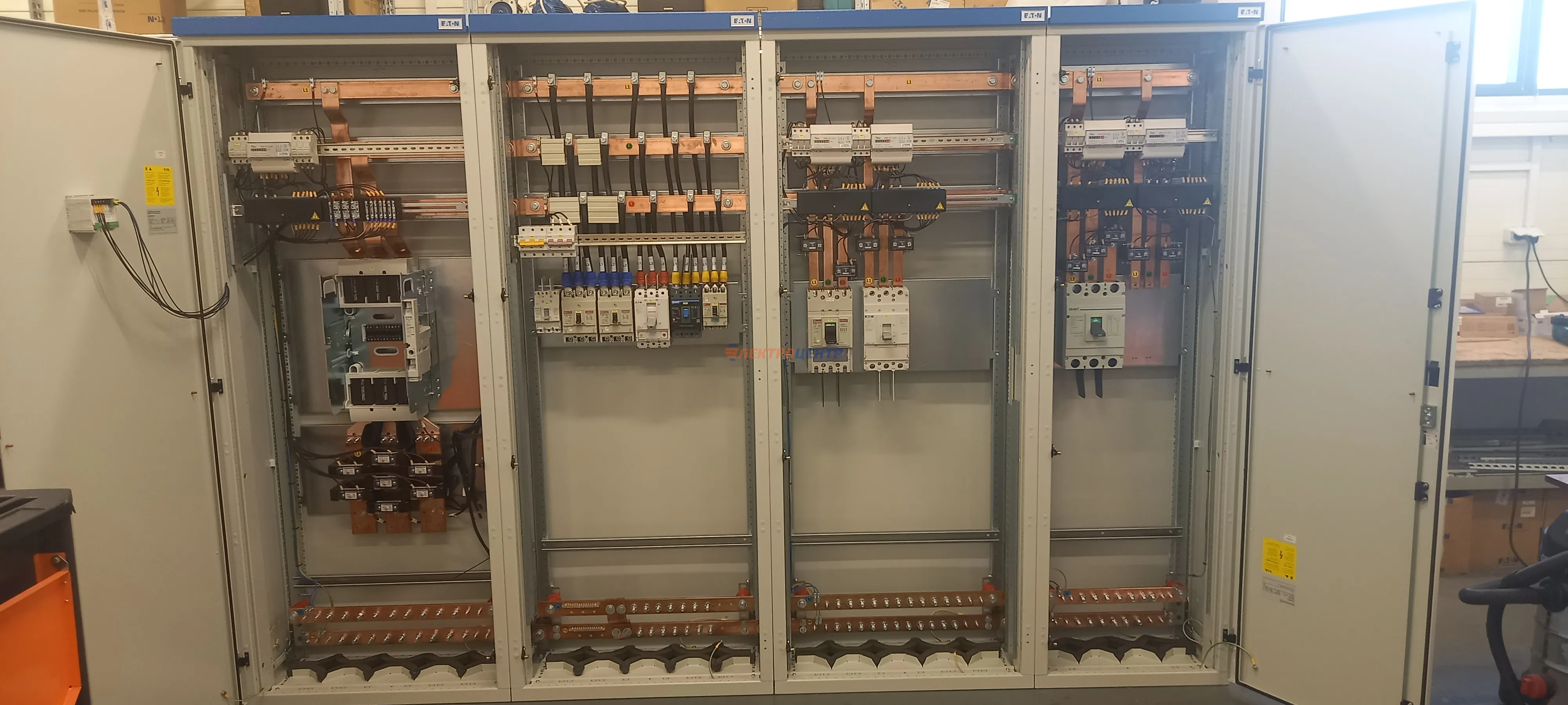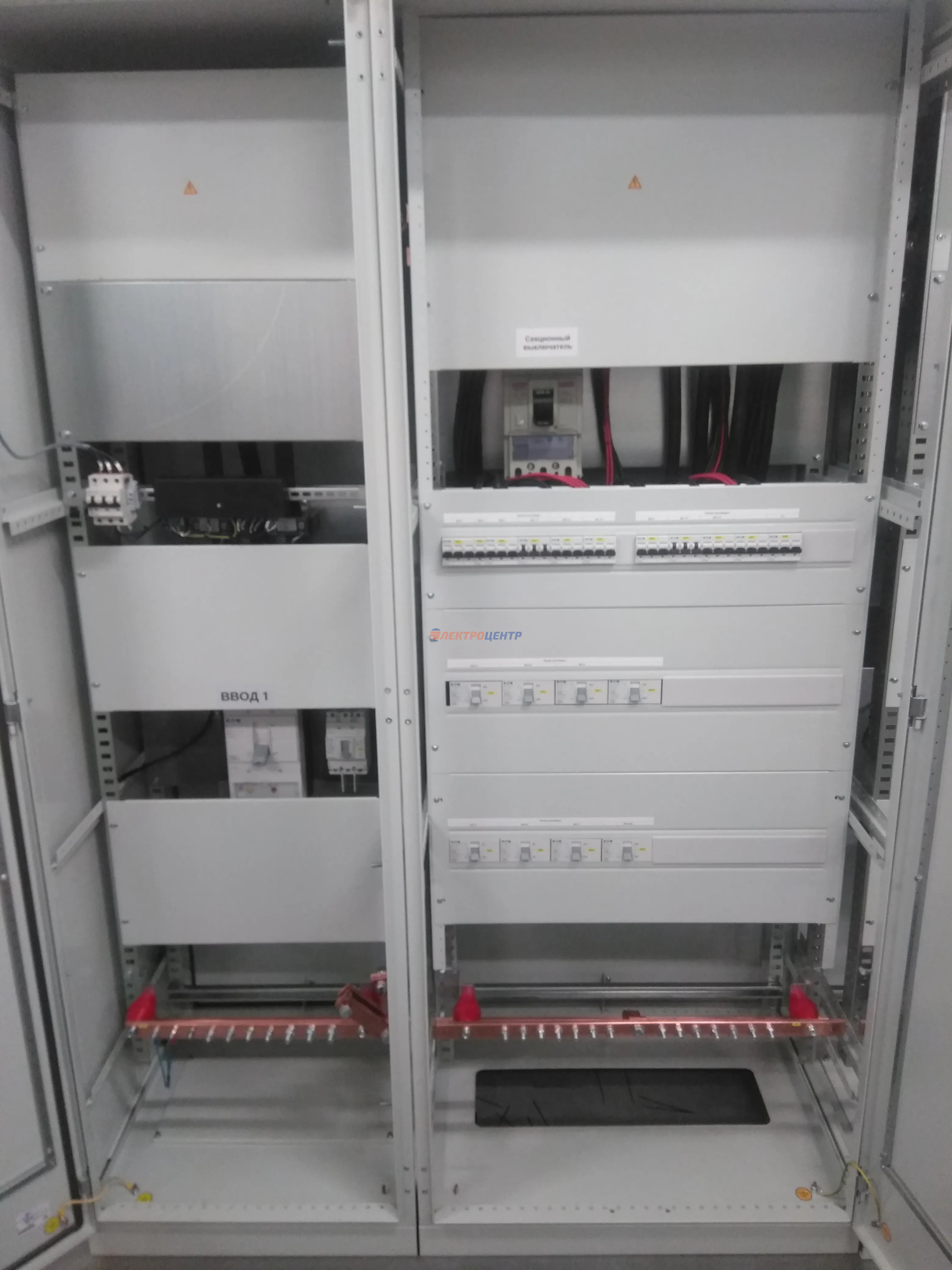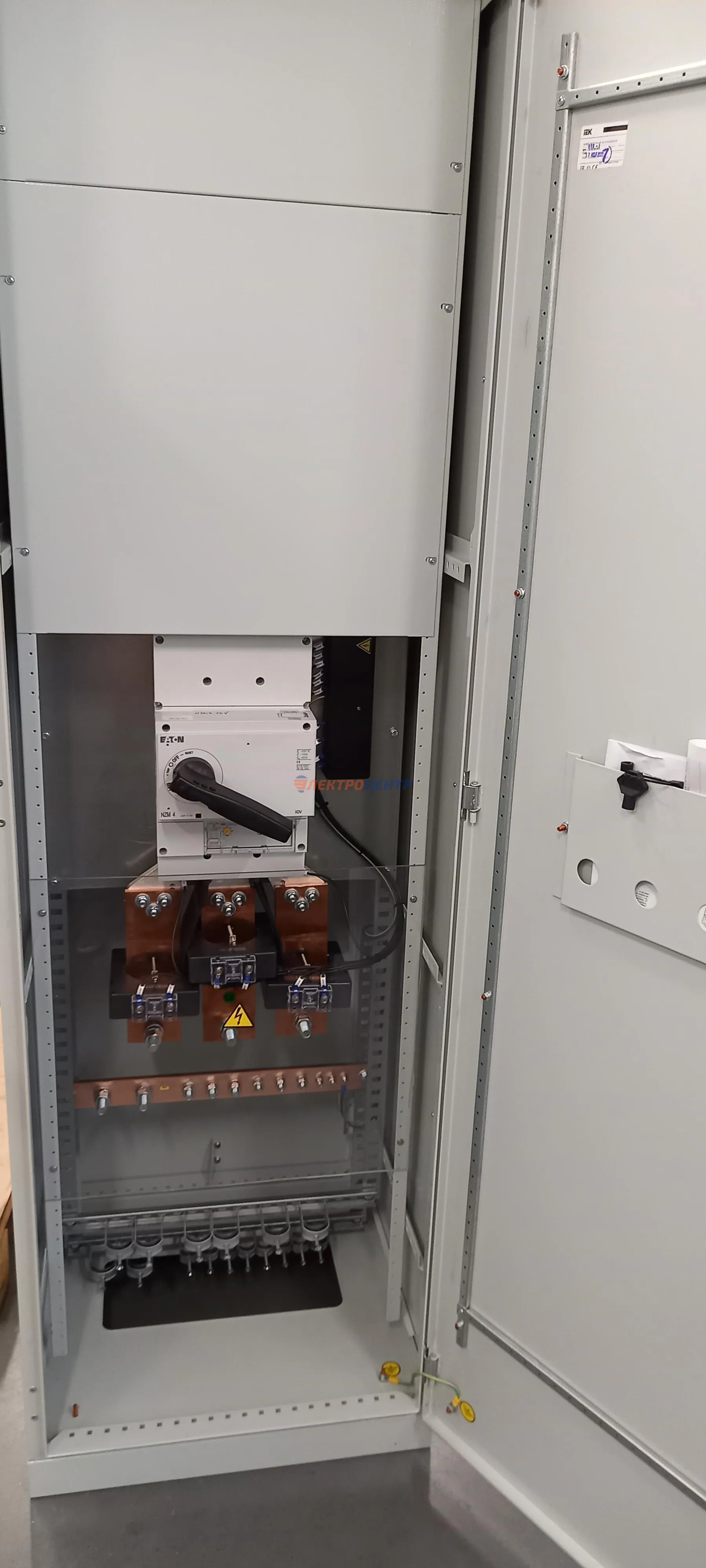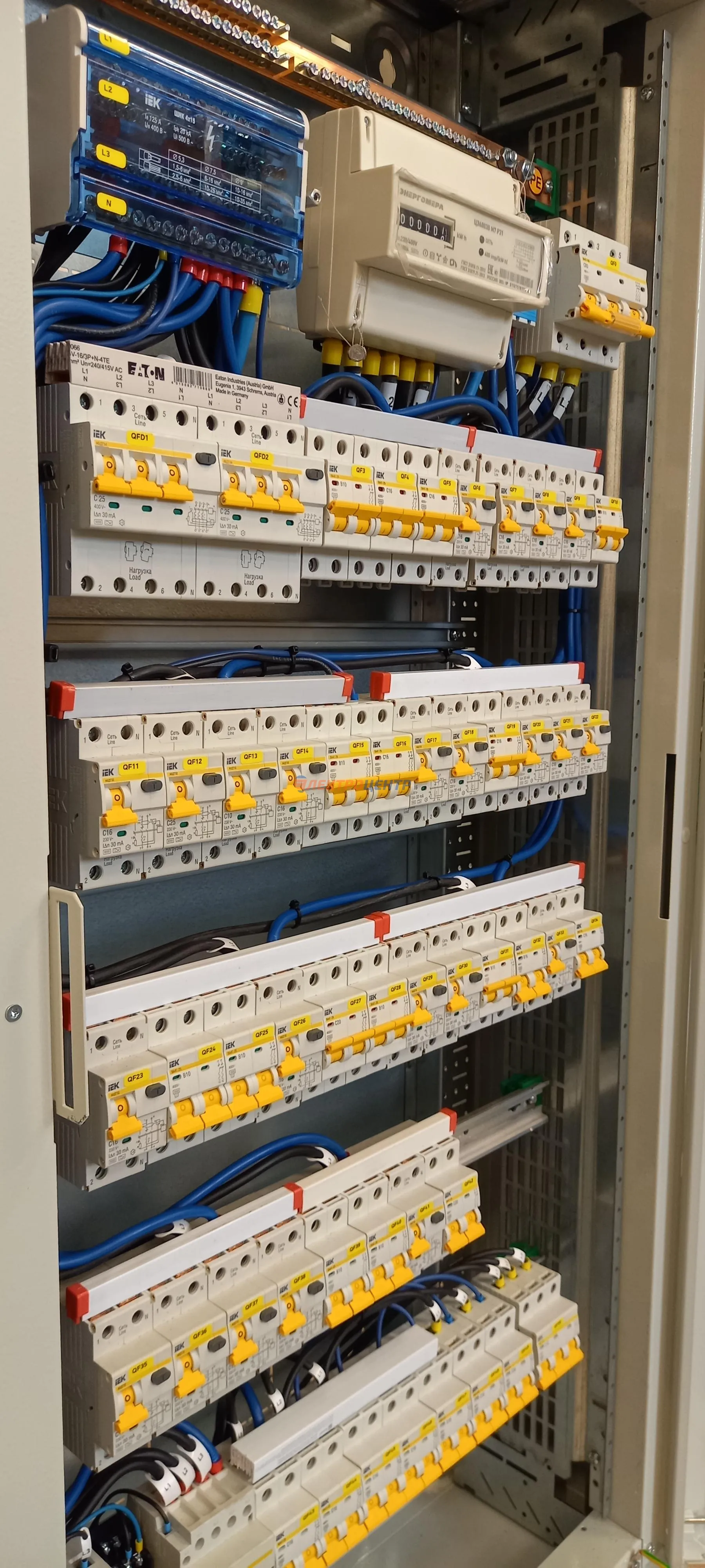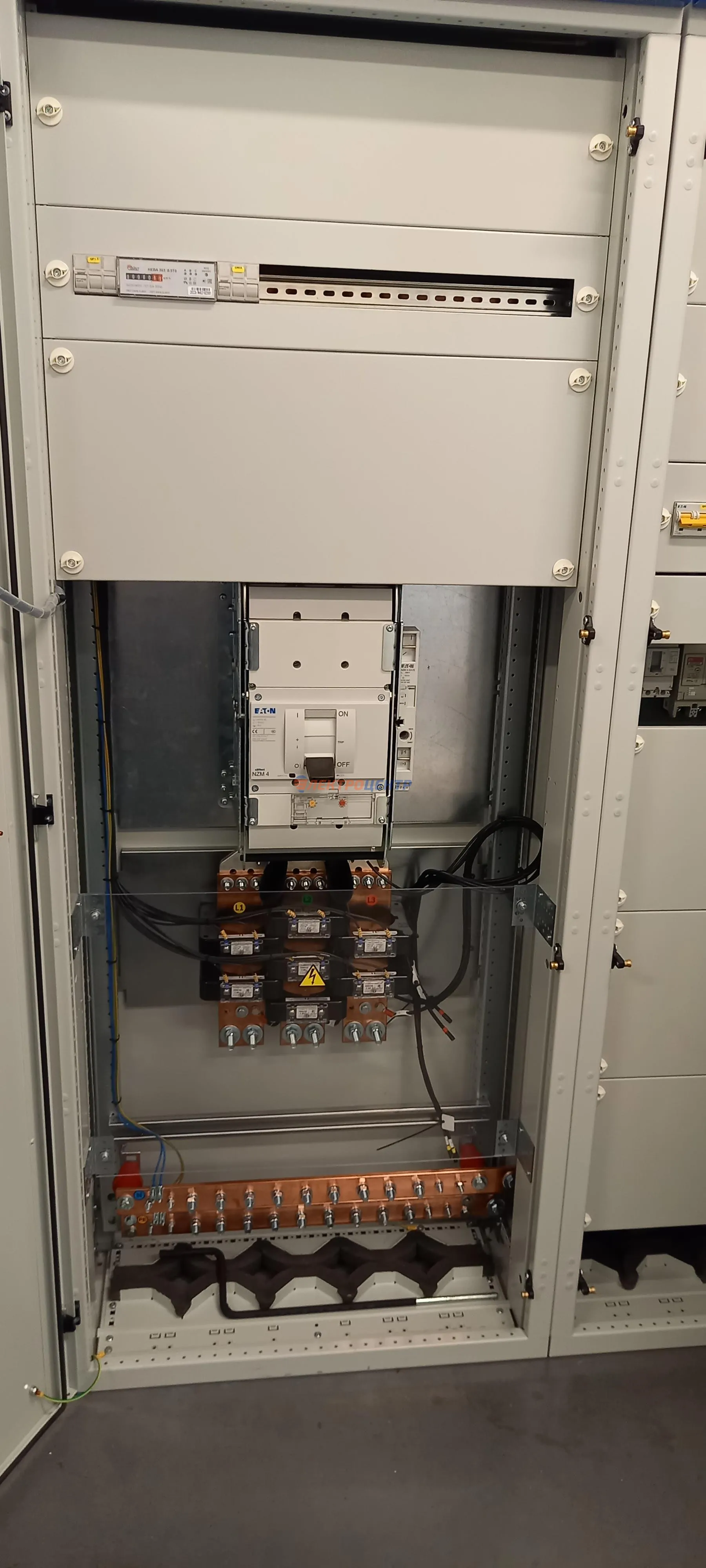 | 47 | ВРУ на 2500 А торгового центра в г. Калининград | «EATON”, “ETI”, “APATOR”, счётчики энергии ЭЛЬСТЕР МЕТРОНИКА, трансформаторы «FRER”, АВР типа MAX-3 «EATON” на 6 выключателей (изменённая схема согласно требованию заказчика). Вводные выключатели типа IZMX40, NZMN4. Оболочка типа “xENERGY” (EATON). На видео представлена проверка сработки выключателей в зависимости от присутствия напряжения на вводах. | Посмотреть фото |