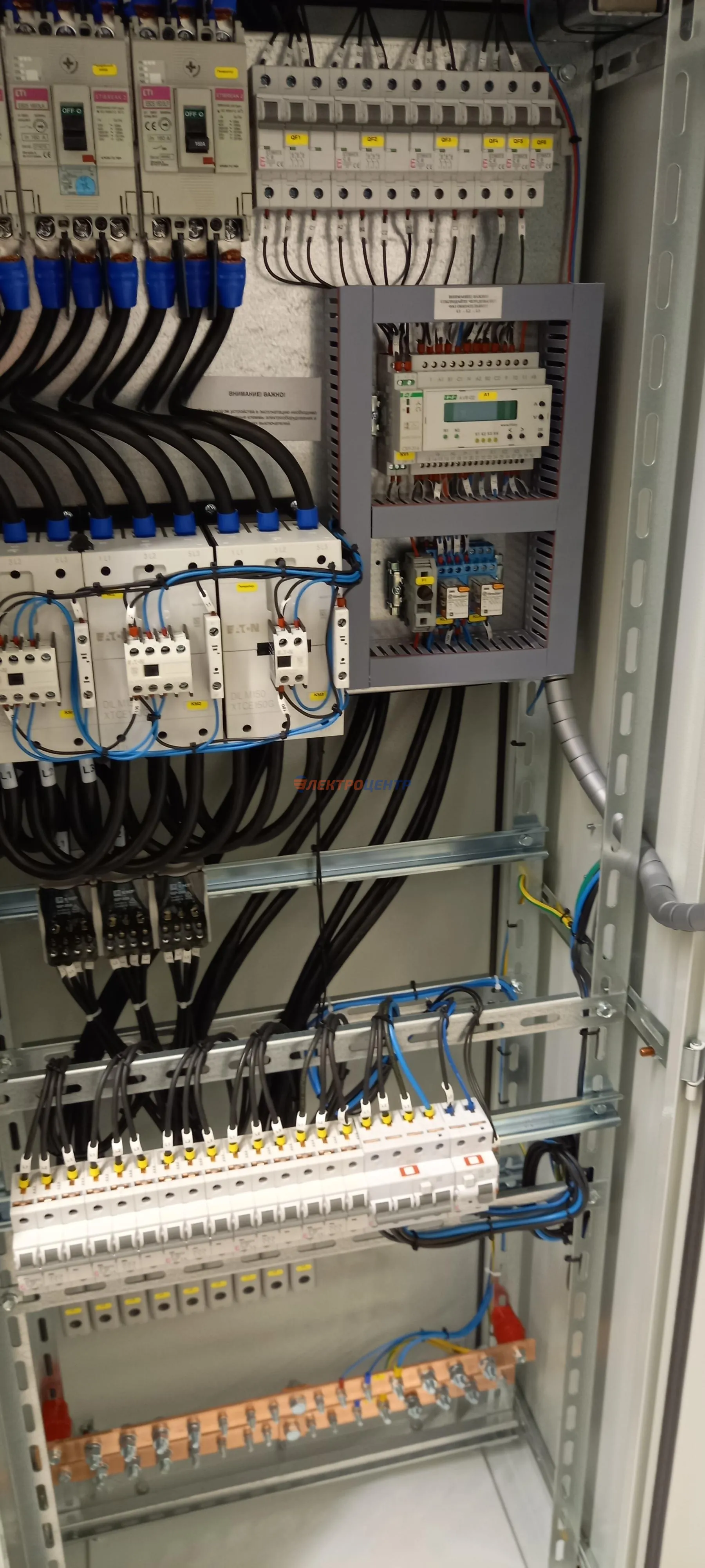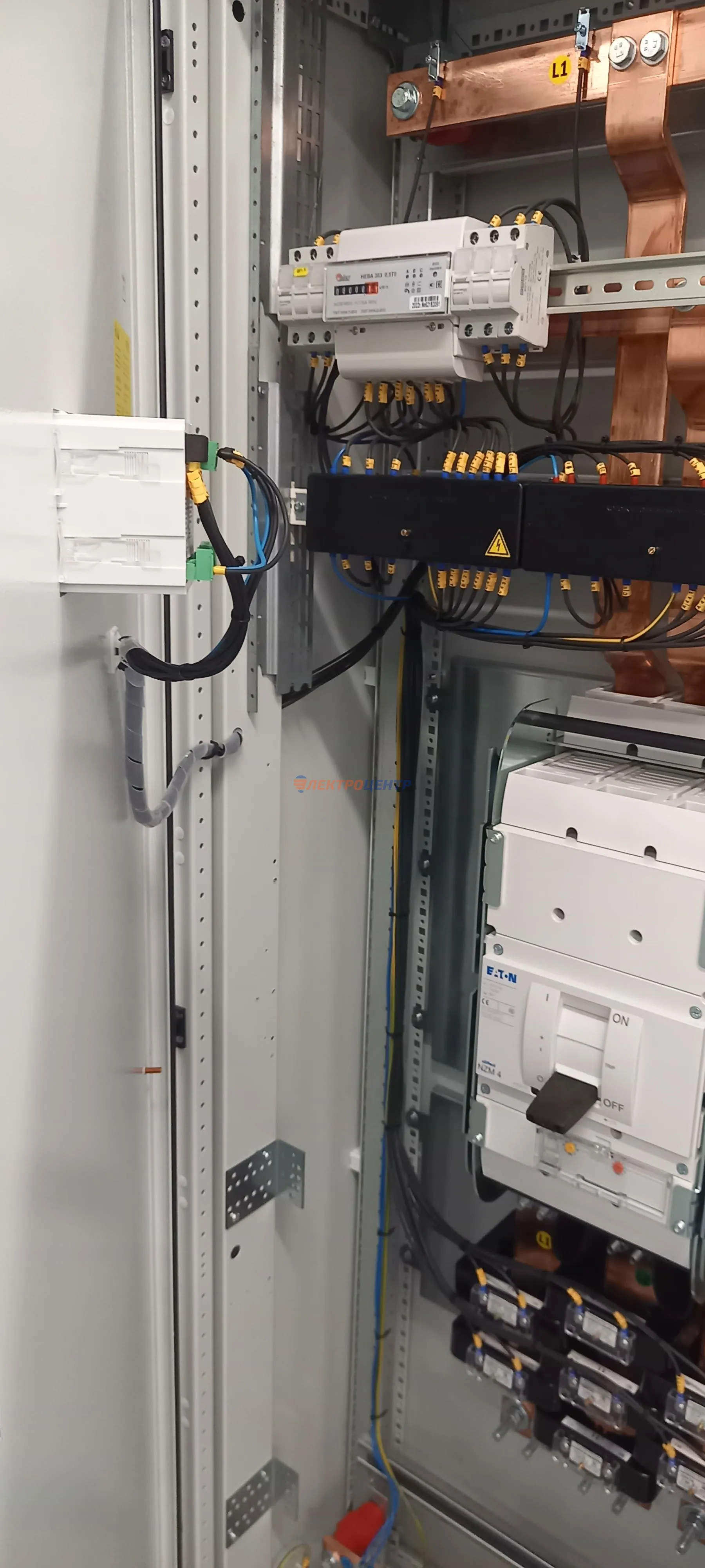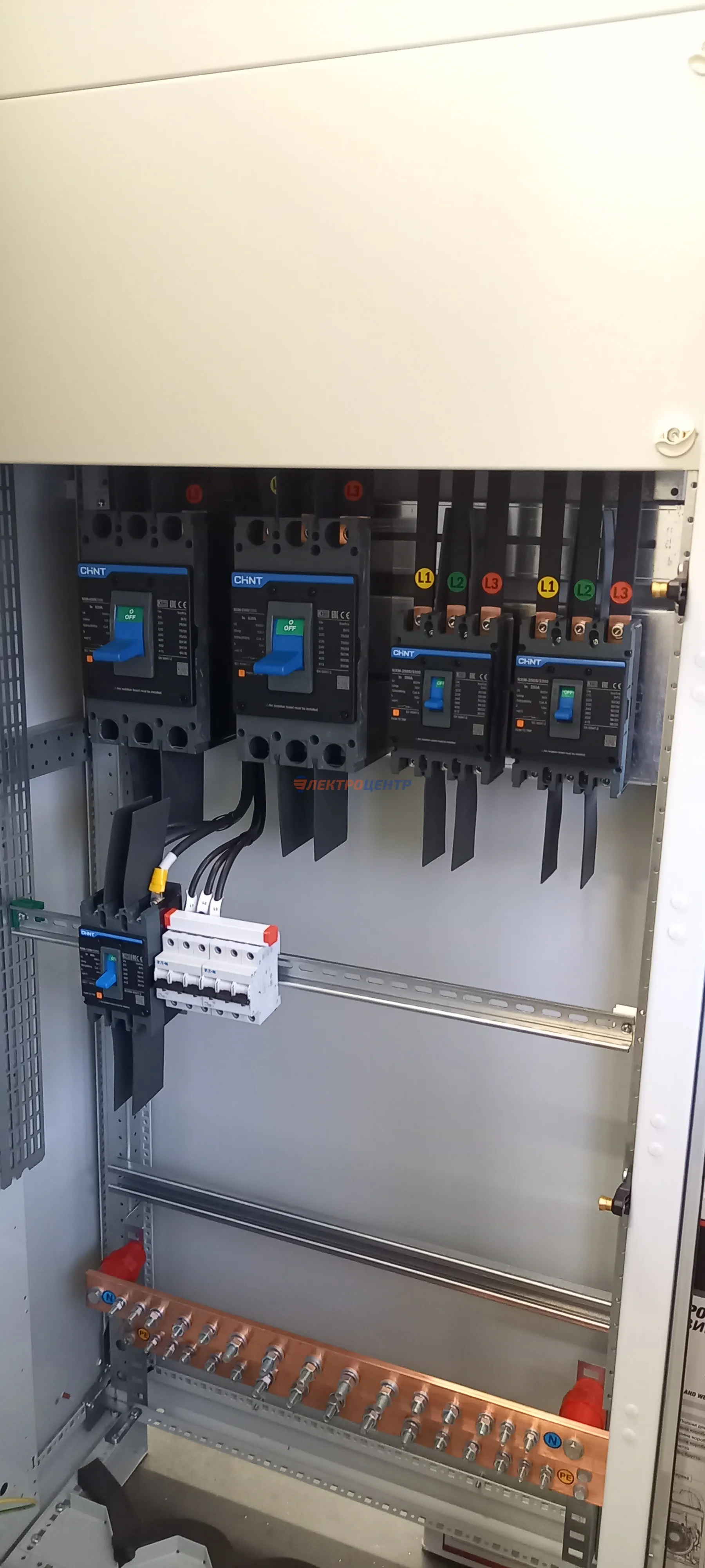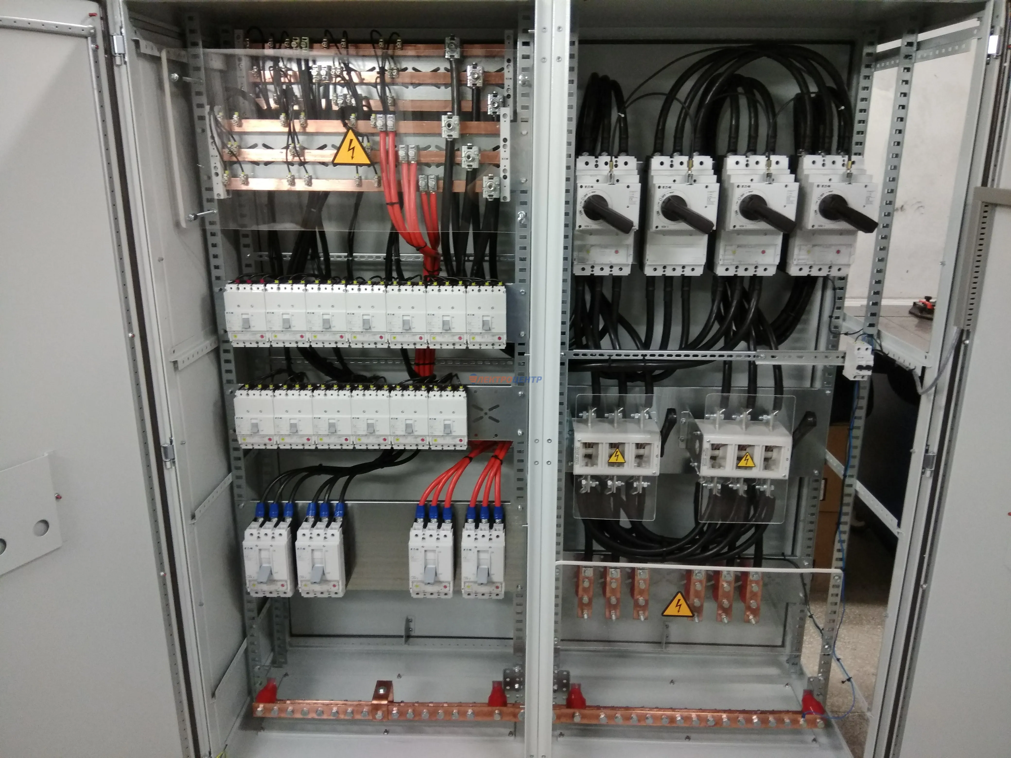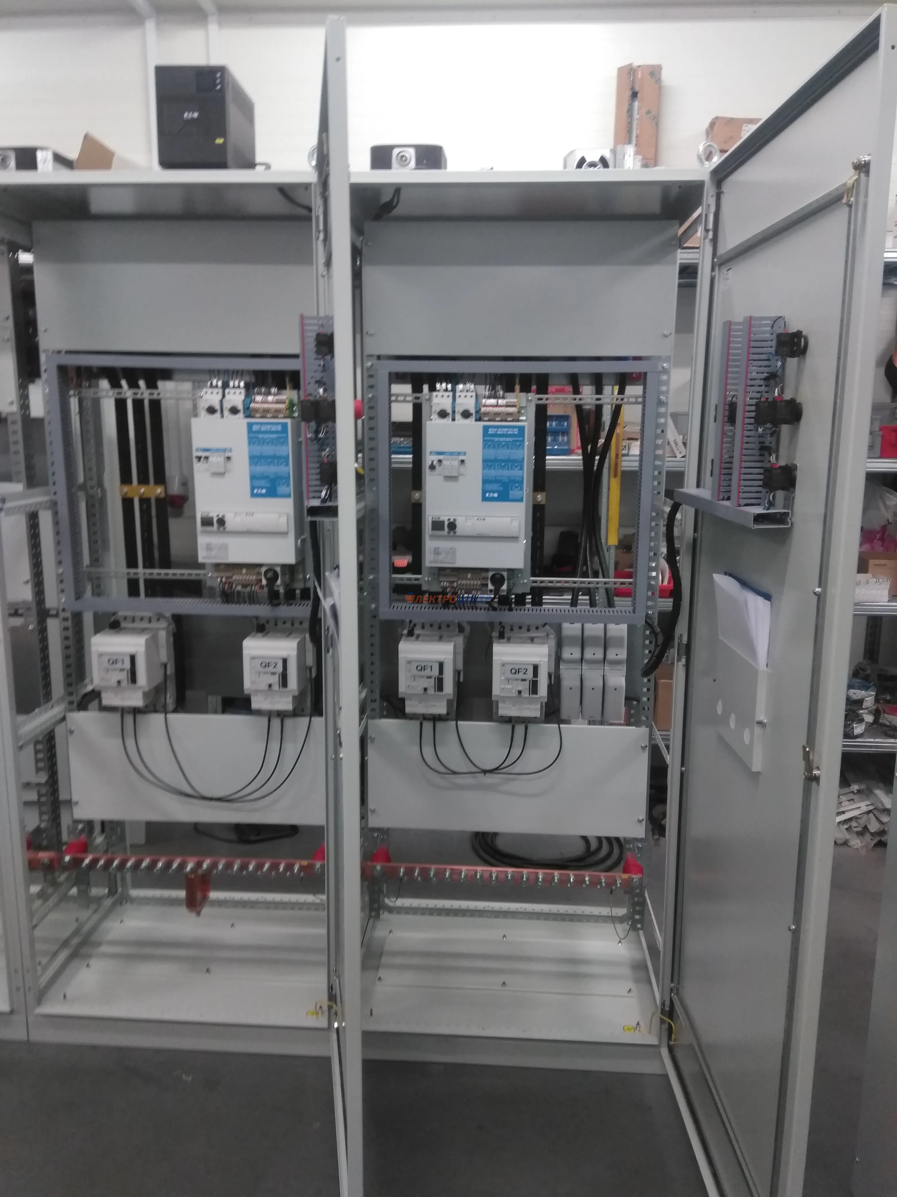 | 47 | ВРУ на 2500 А торгового центра в г. Калининград | «EATON”, “ETI”, “APATOR”, счётчики энергии ЭЛЬСТЕР МЕТРОНИКА, трансформаторы «FRER”, АВР типа MAX-3 «EATON” на 6 выключателей (изменённая схема согласно требованию заказчика). Вводные выключатели типа IZMX40, NZMN4. Оболочка типа “xENERGY” (EATON). На видео представлена проверка сработки выключателей в зависимости от присутствия напряжения на вводах. | Посмотреть фото |