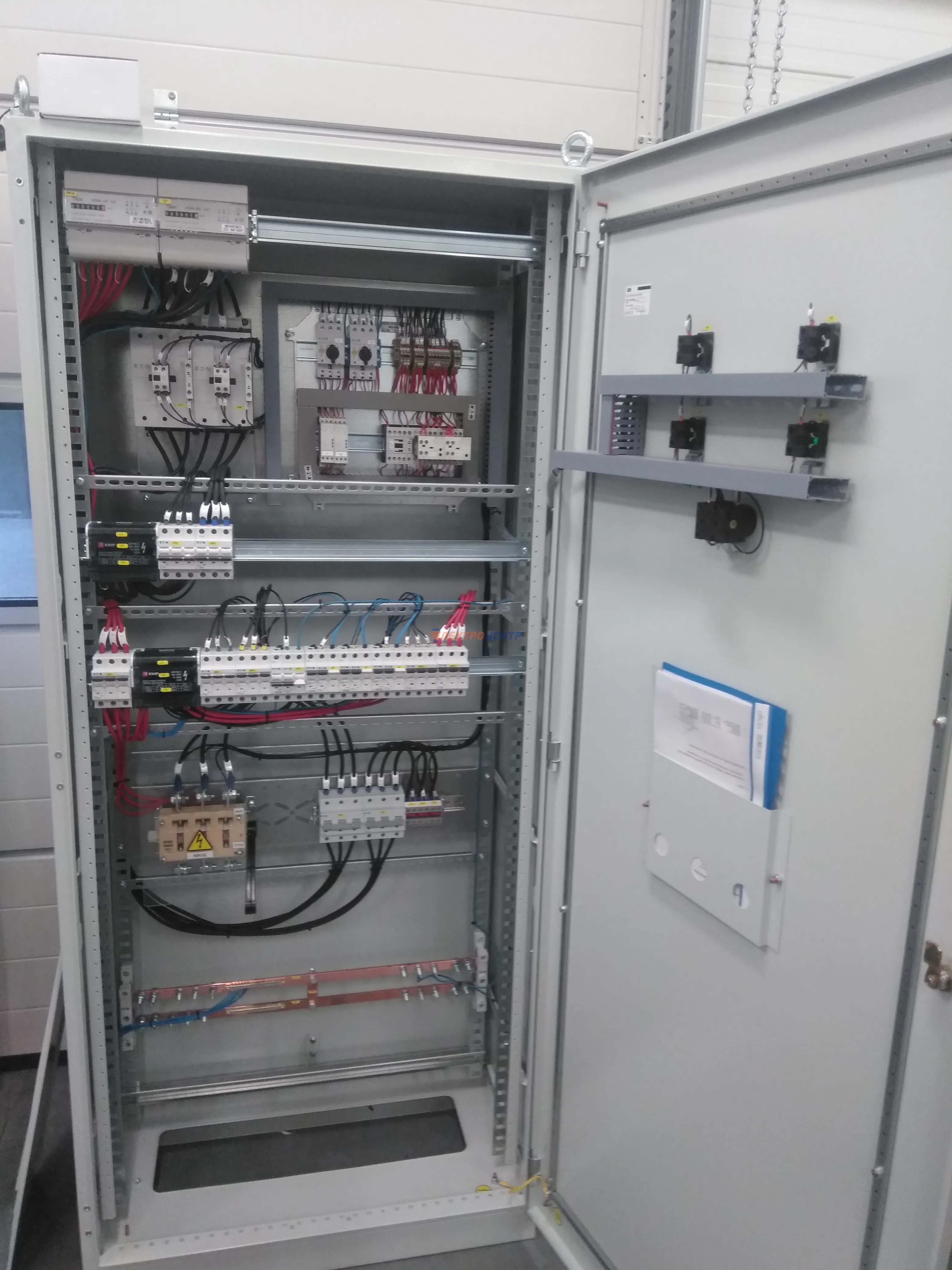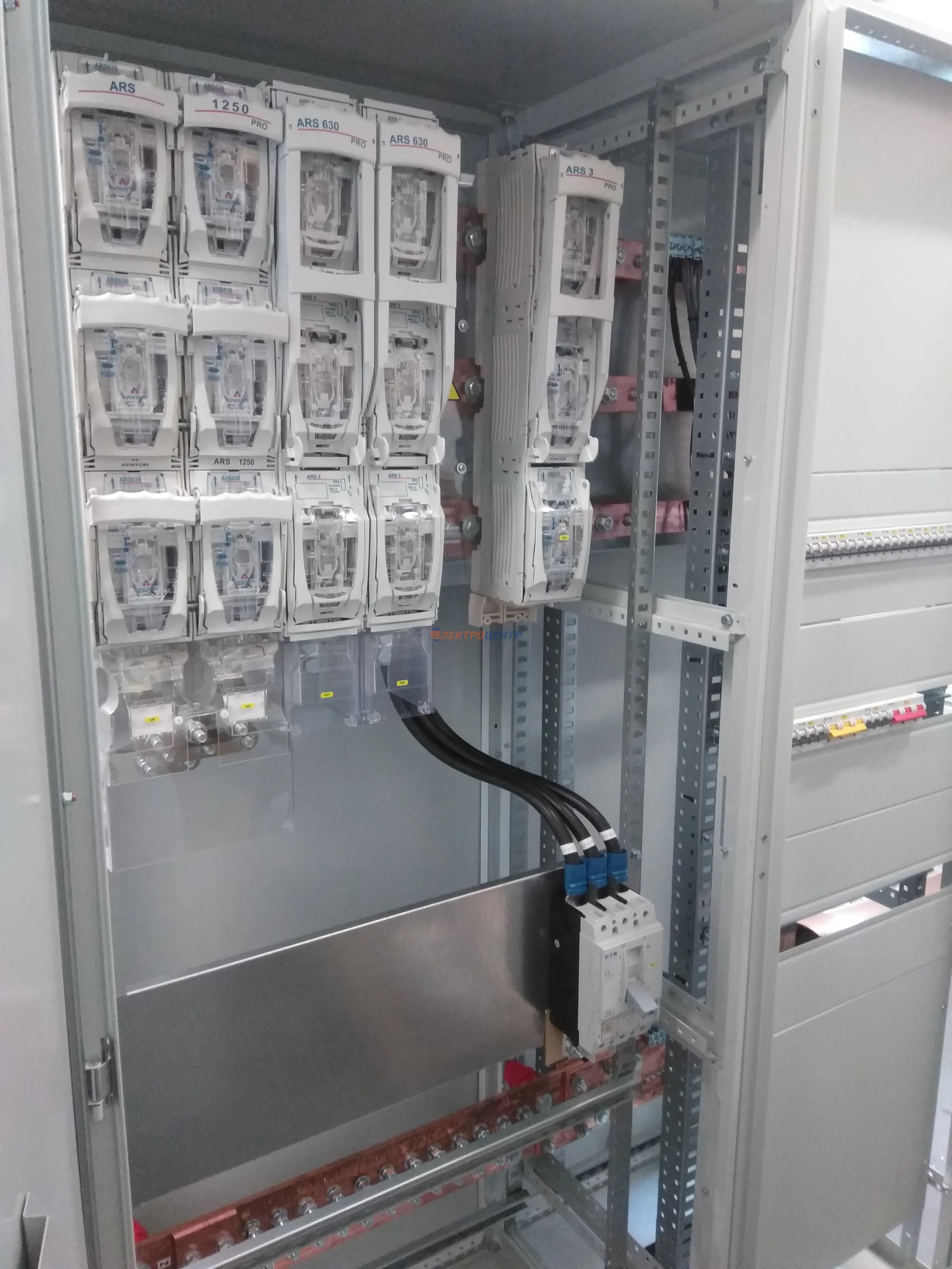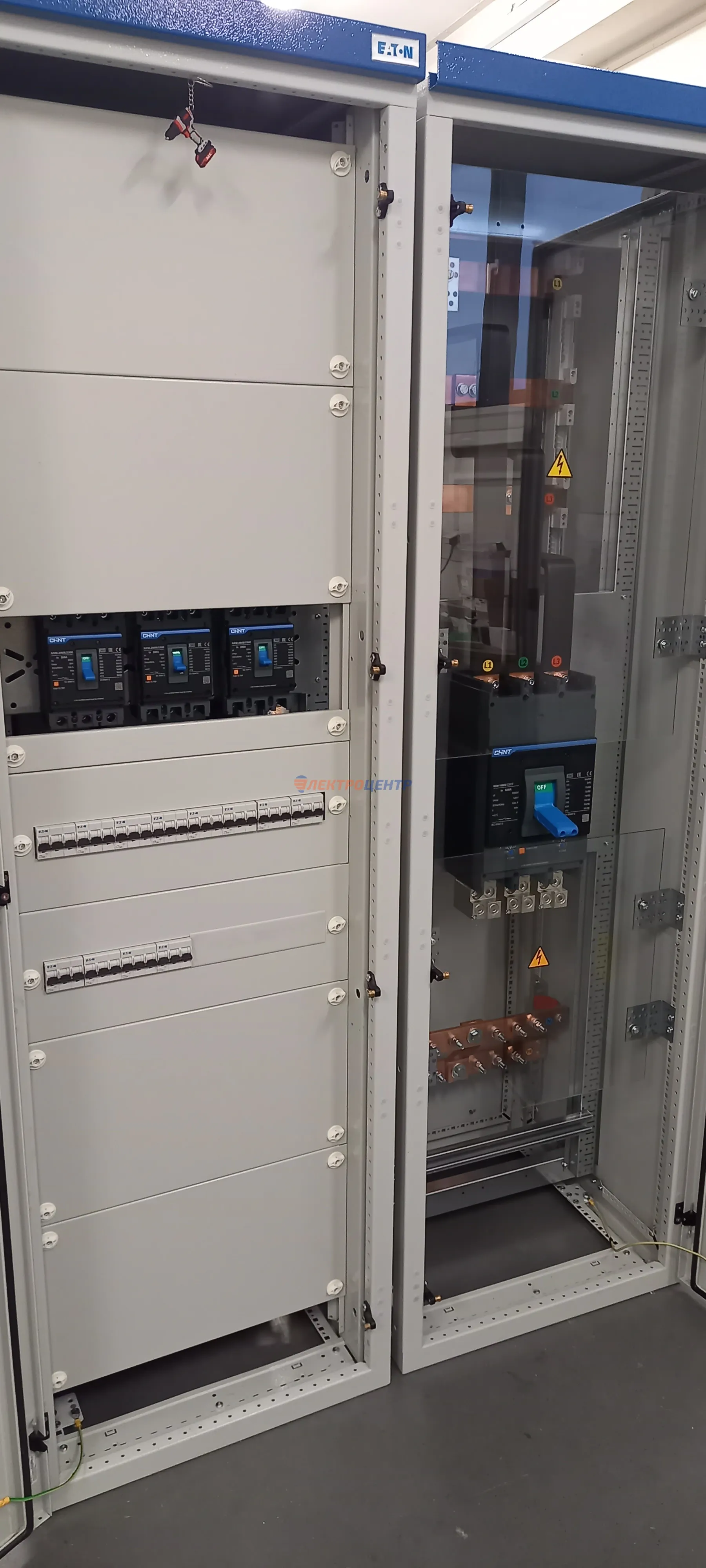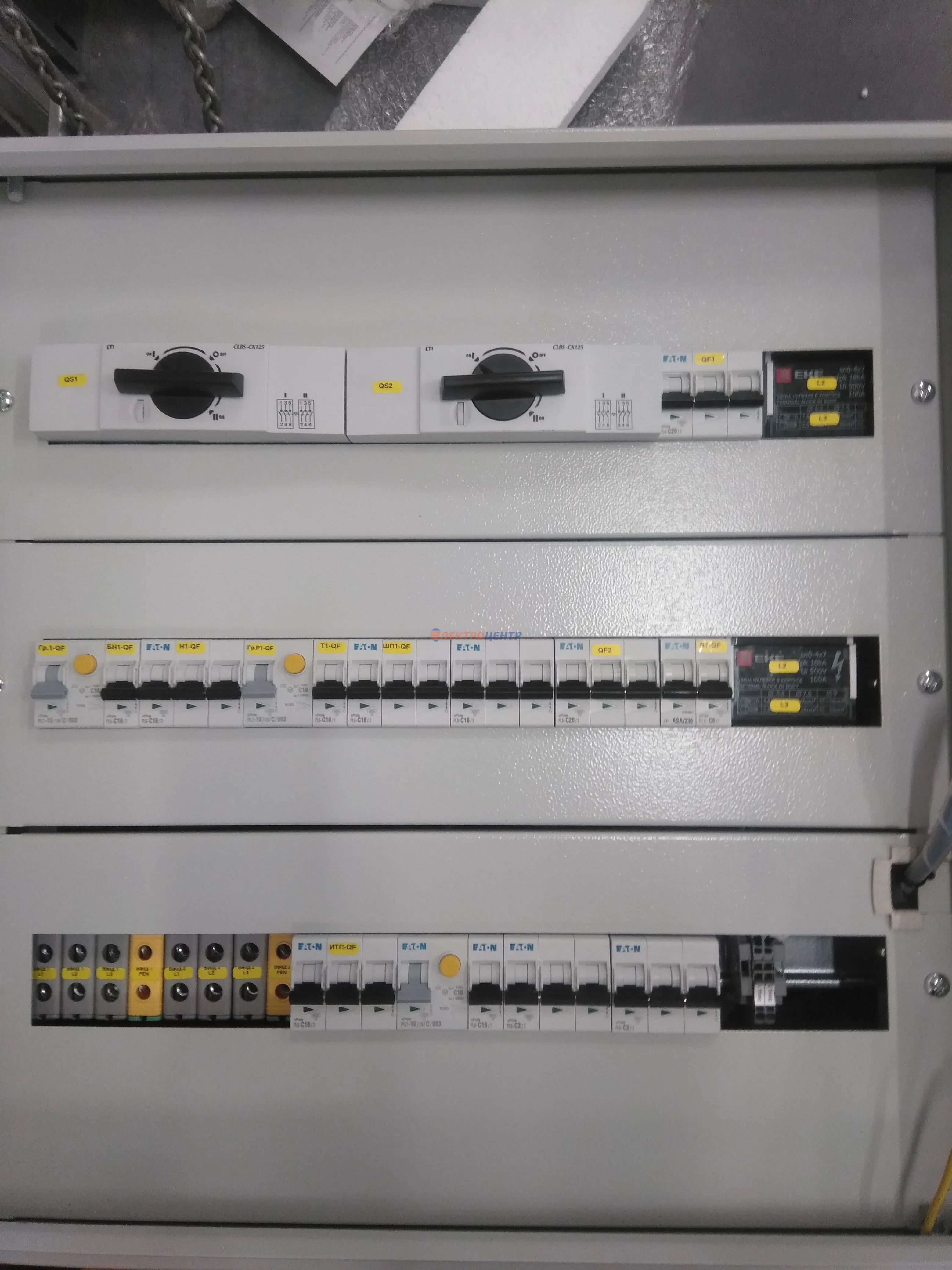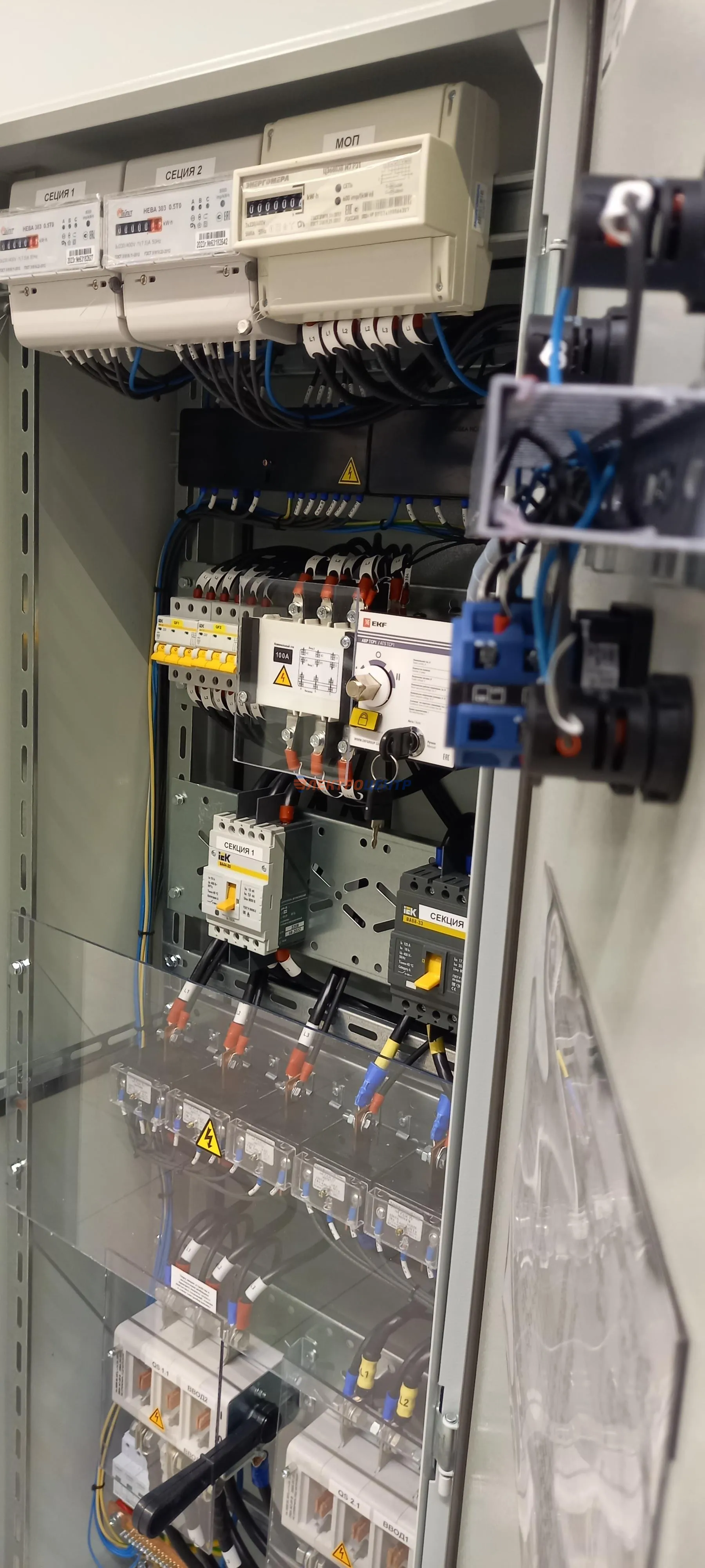 | 47 | ВРУ на 2500 А торгового центра в г. Калининград | «EATON”, “ETI”, “APATOR”, счётчики энергии ЭЛЬСТЕР МЕТРОНИКА, трансформаторы «FRER”, АВР типа MAX-3 «EATON” на 6 выключателей (изменённая схема согласно требованию заказчика). Вводные выключатели типа IZMX40, NZMN4. Оболочка типа “xENERGY” (EATON). На видео представлена проверка сработки выключателей в зависимости от присутствия напряжения на вводах. | Посмотреть фото |