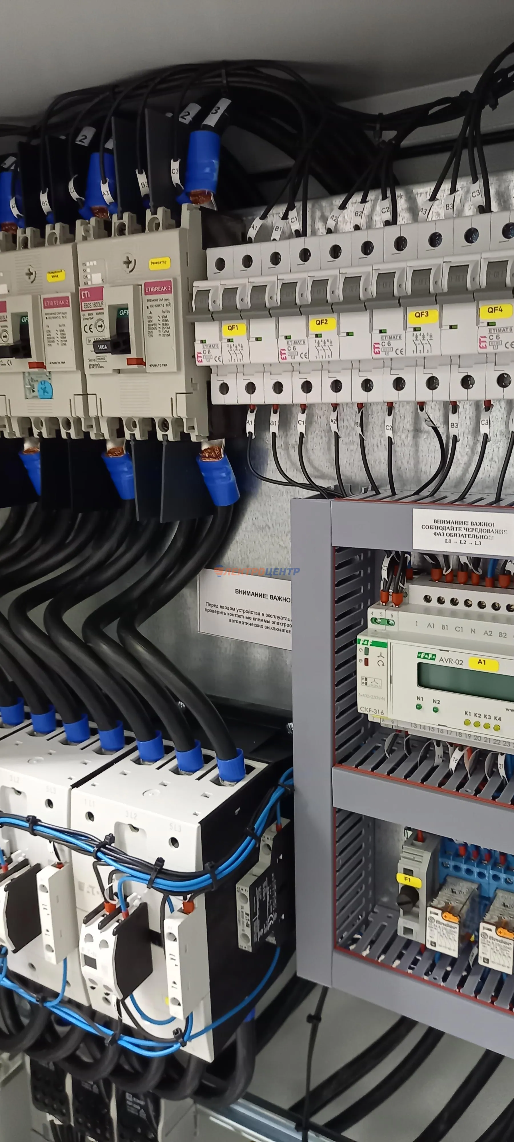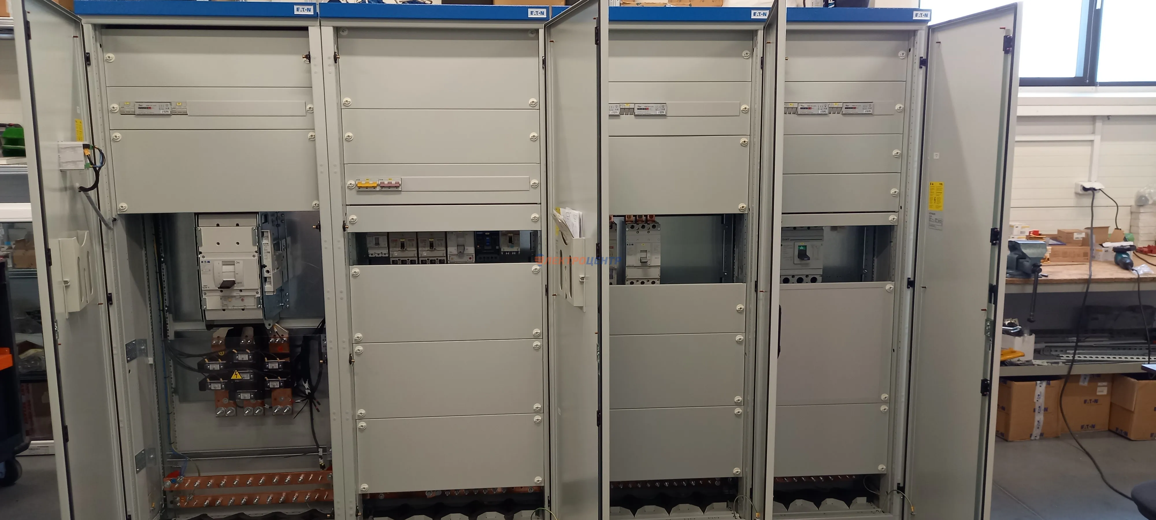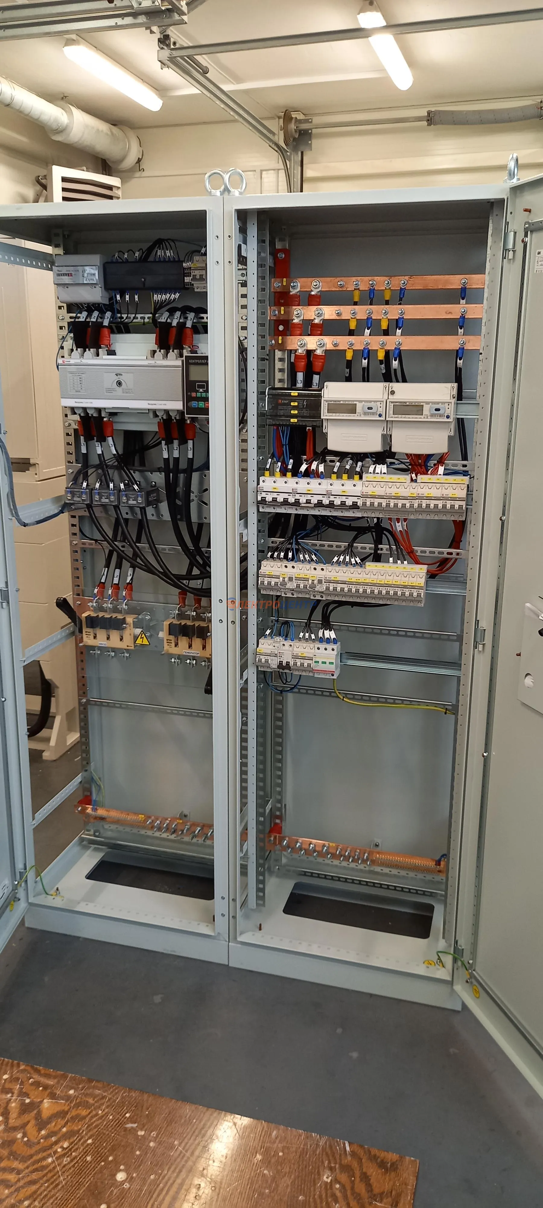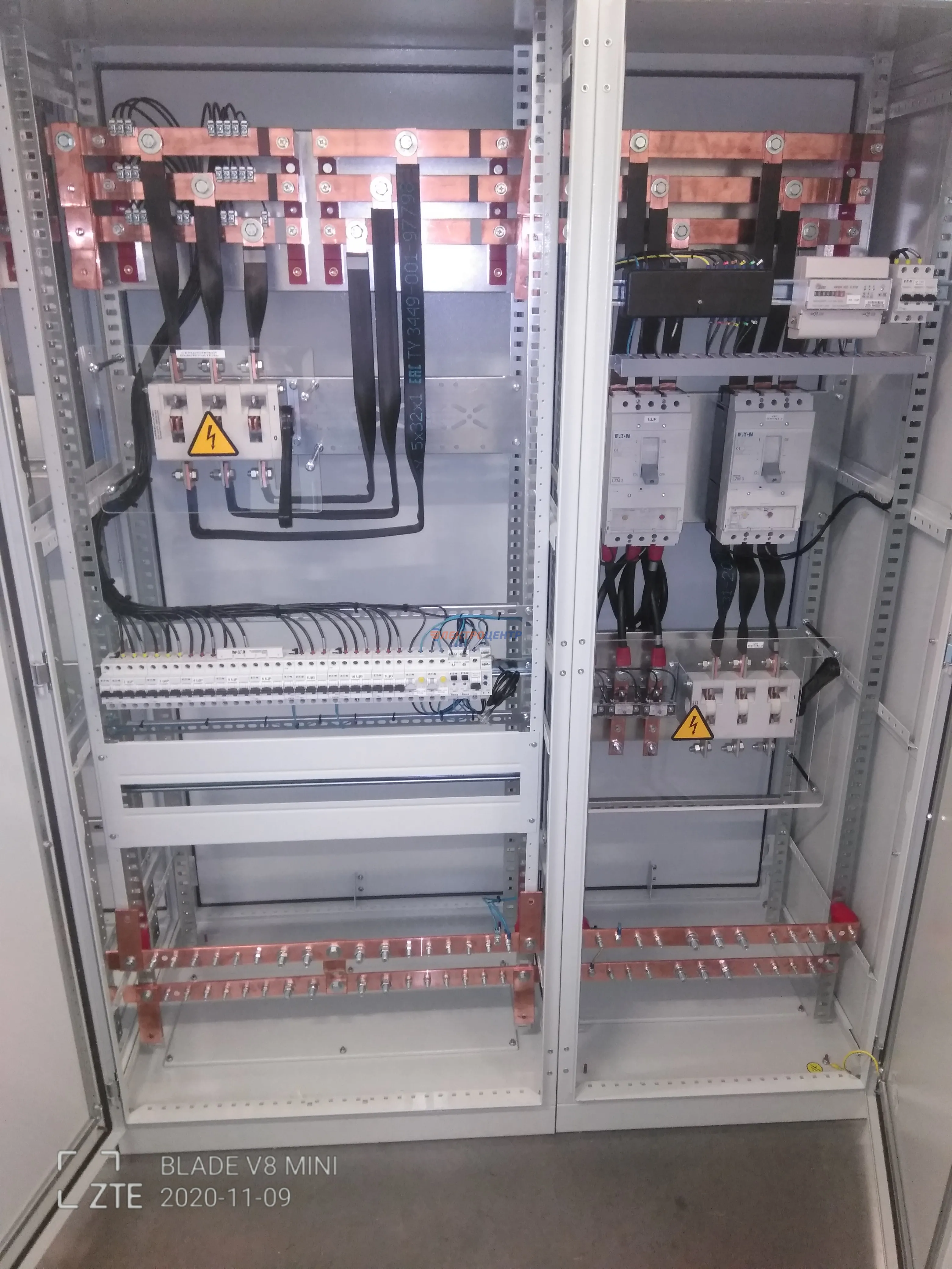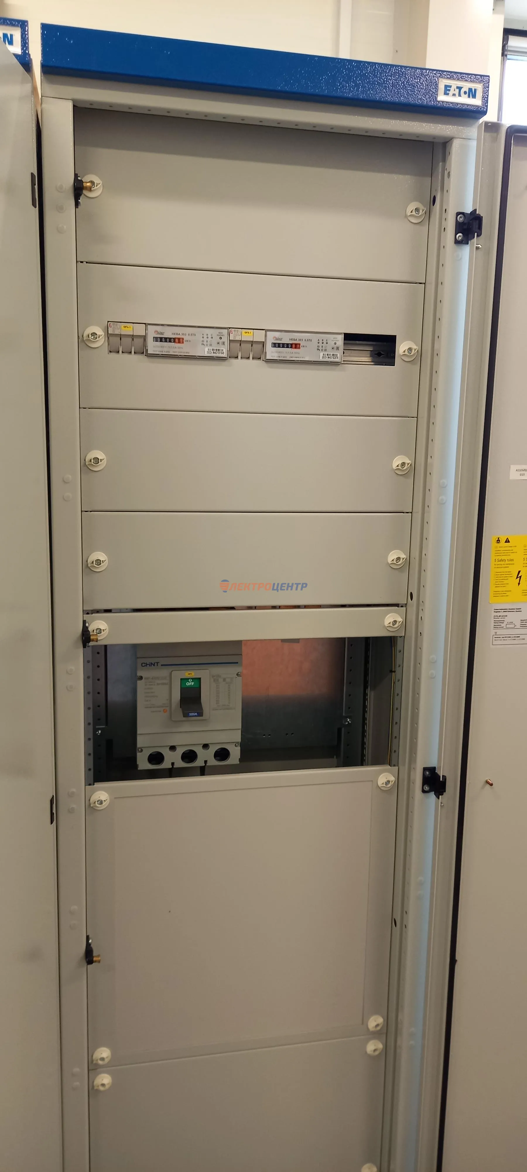 | 47 | ВРУ на 2500 А торгового центра в г. Калининград | «EATON”, “ETI”, “APATOR”, счётчики энергии ЭЛЬСТЕР МЕТРОНИКА, трансформаторы «FRER”, АВР типа MAX-3 «EATON” на 6 выключателей (изменённая схема согласно требованию заказчика). Вводные выключатели типа IZMX40, NZMN4. Оболочка типа “xENERGY” (EATON). На видео представлена проверка сработки выключателей в зависимости от присутствия напряжения на вводах. | Посмотреть фото |