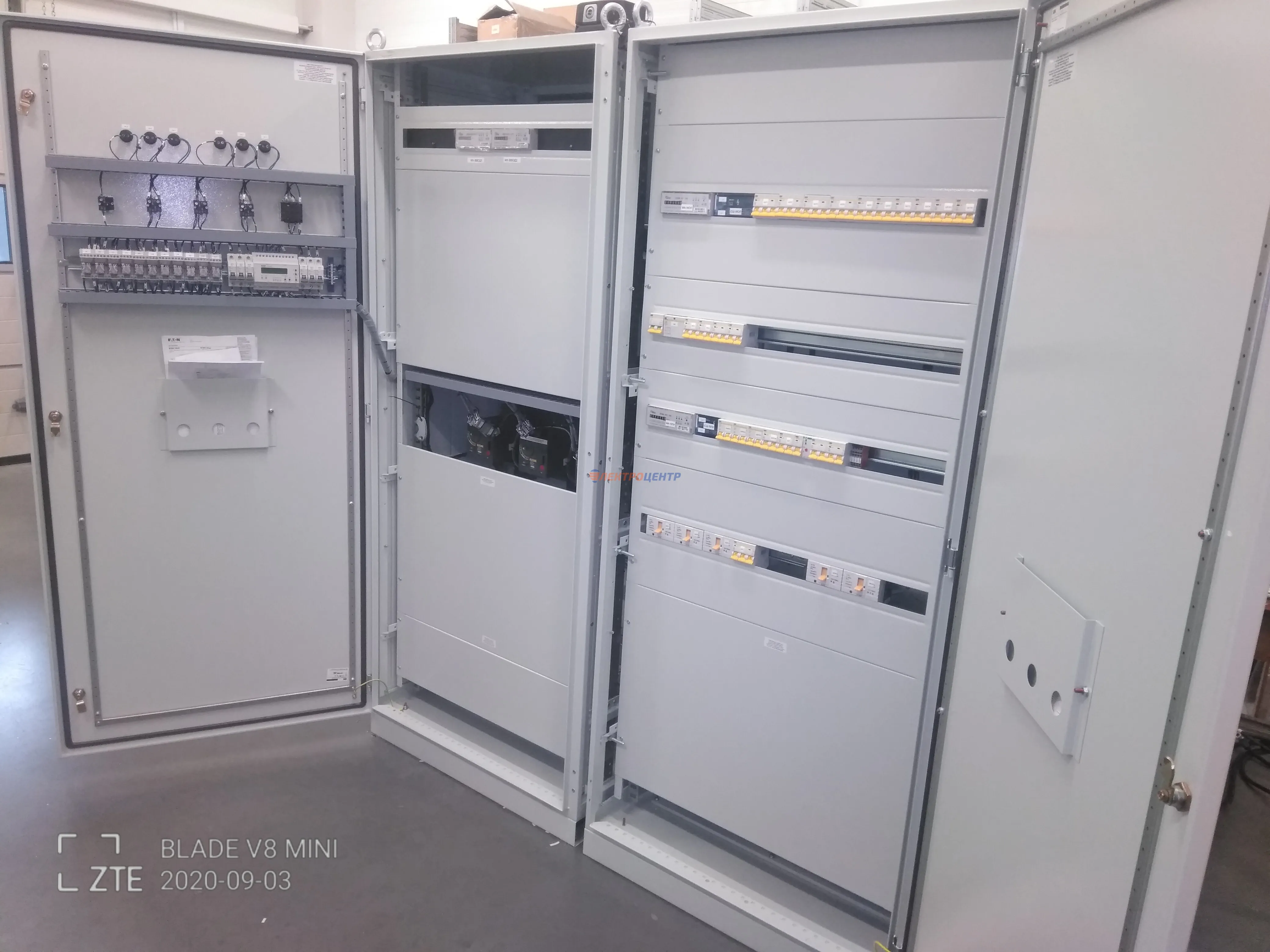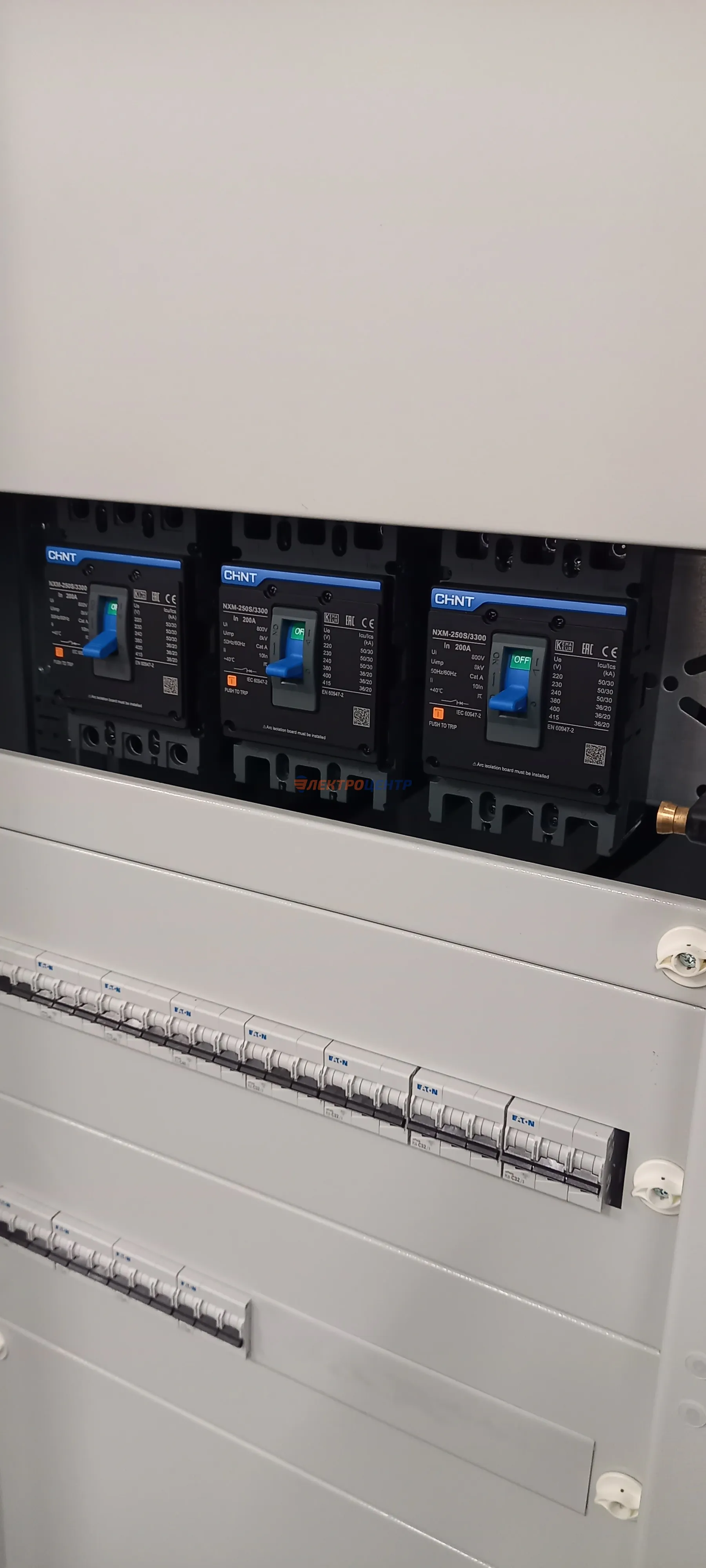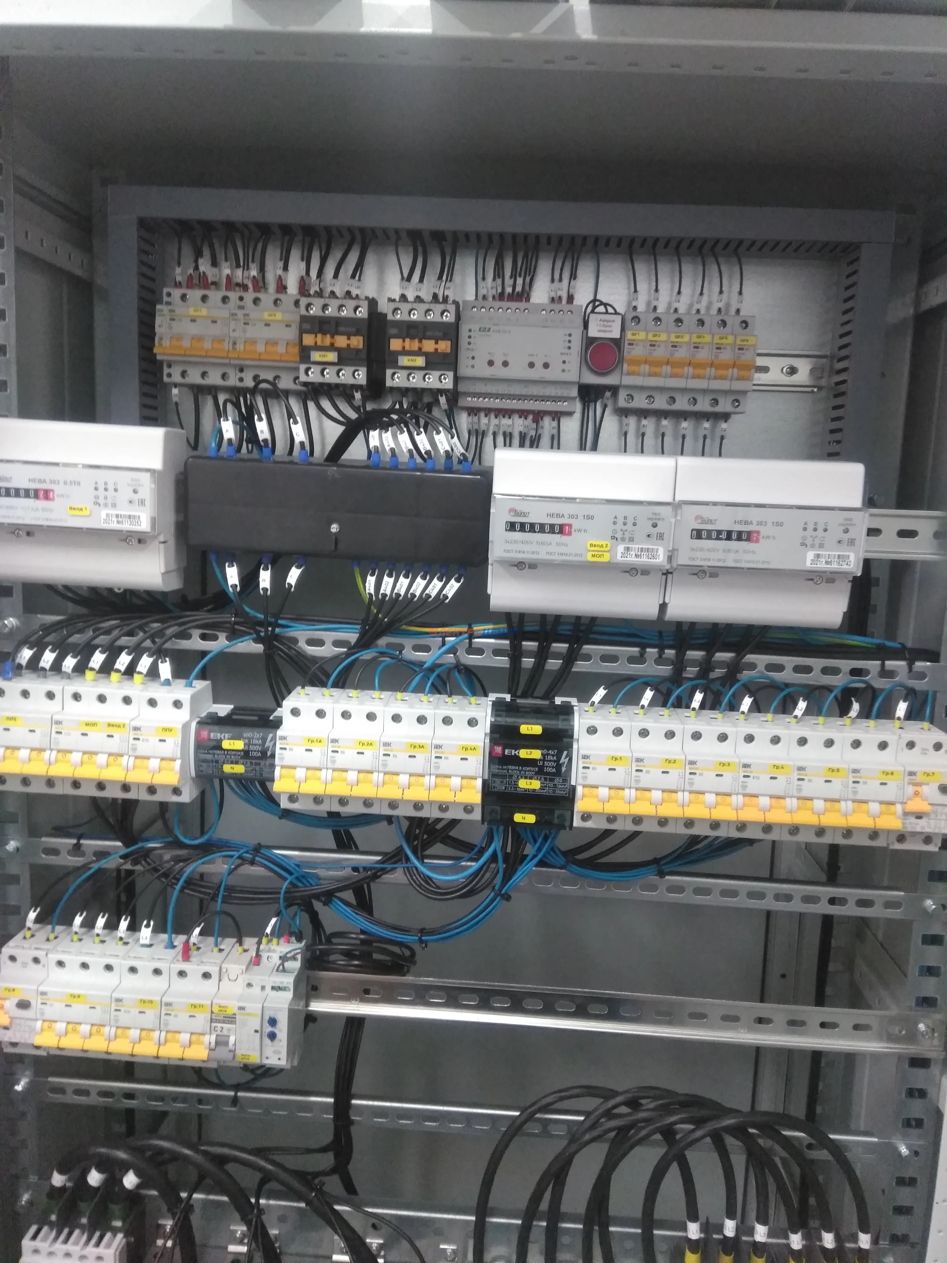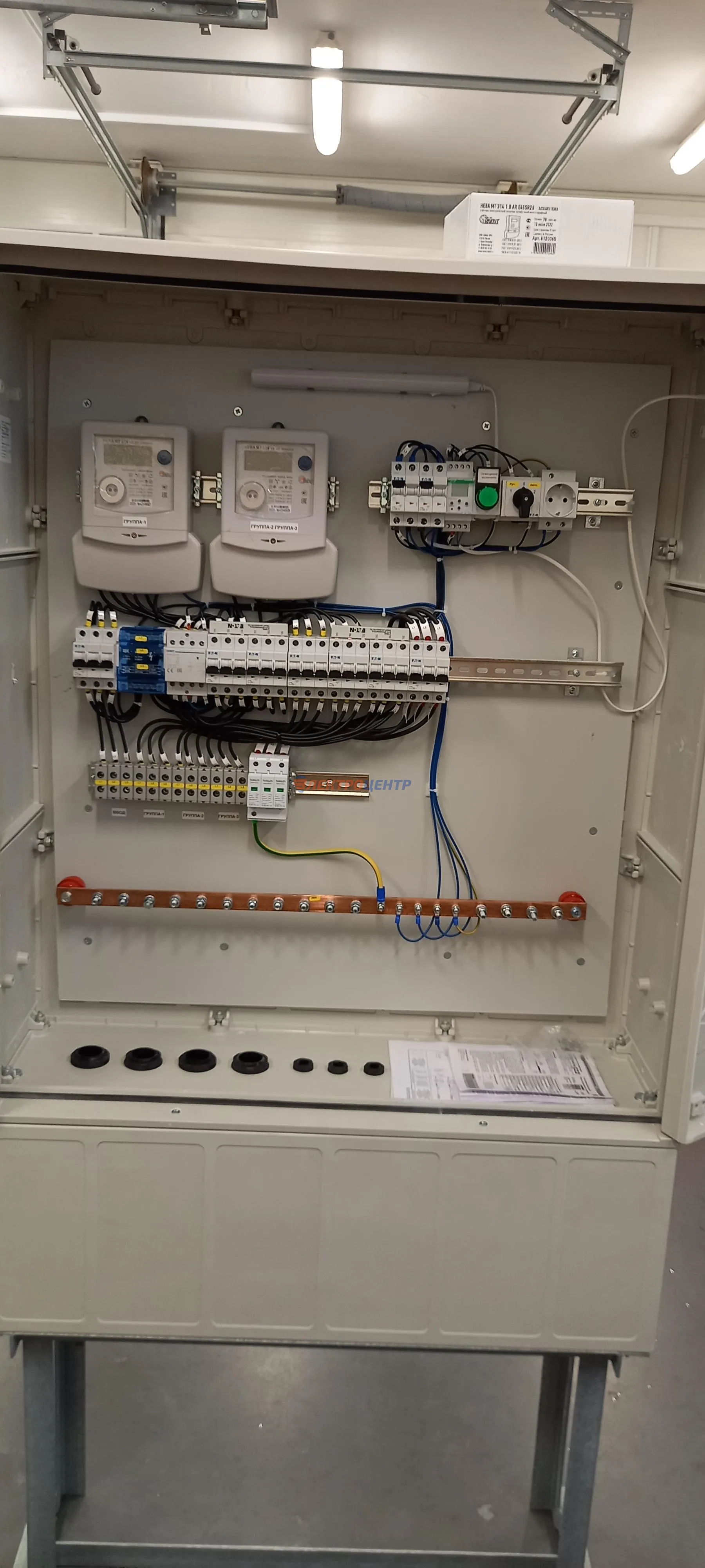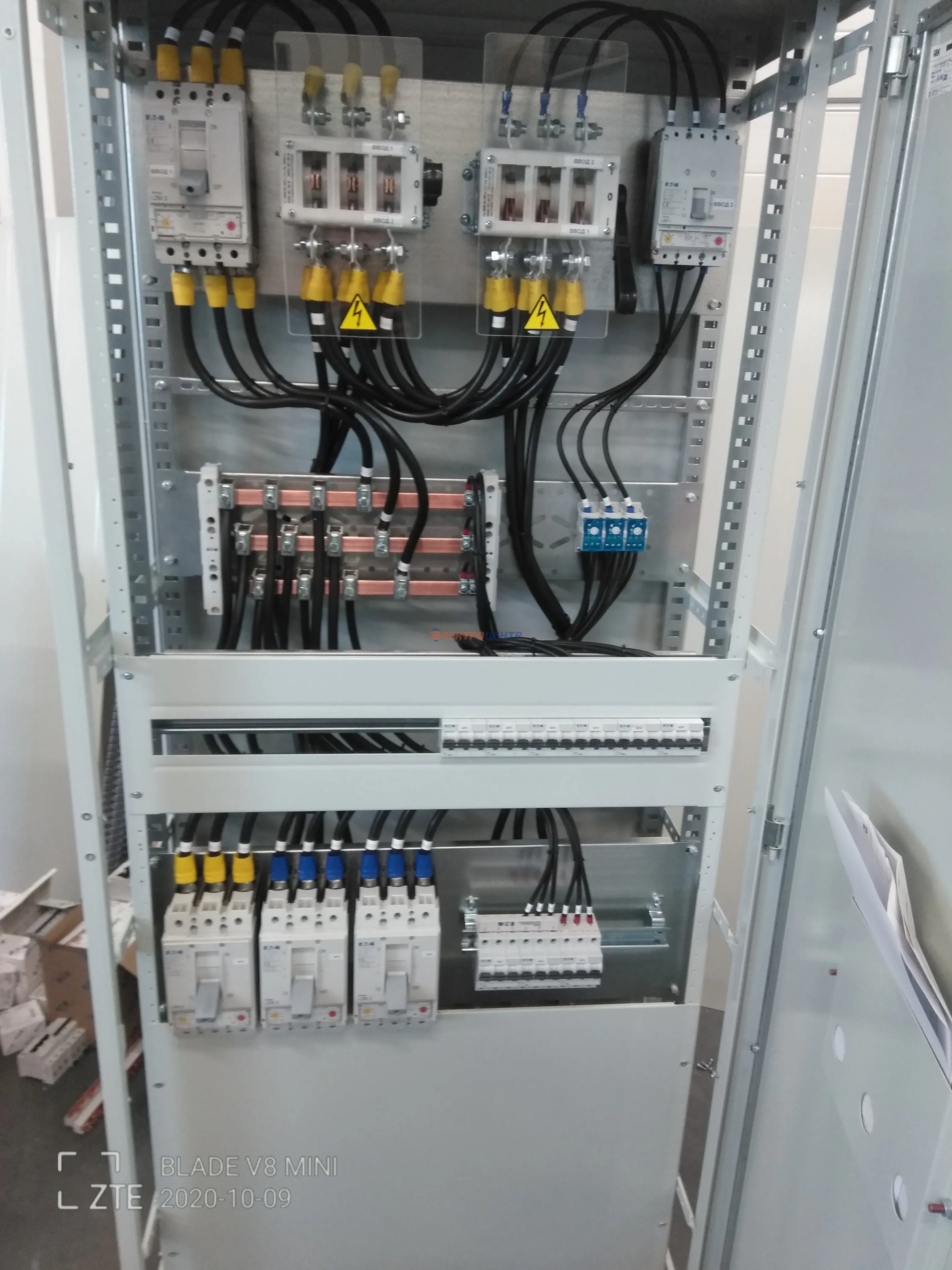 | 47 | ВРУ на 2500 А торгового центра в г. Калининград | «EATON”, “ETI”, “APATOR”, счётчики энергии ЭЛЬСТЕР МЕТРОНИКА, трансформаторы «FRER”, АВР типа MAX-3 «EATON” на 6 выключателей (изменённая схема согласно требованию заказчика). Вводные выключатели типа IZMX40, NZMN4. Оболочка типа “xENERGY” (EATON). На видео представлена проверка сработки выключателей в зависимости от присутствия напряжения на вводах. | Посмотреть фото |