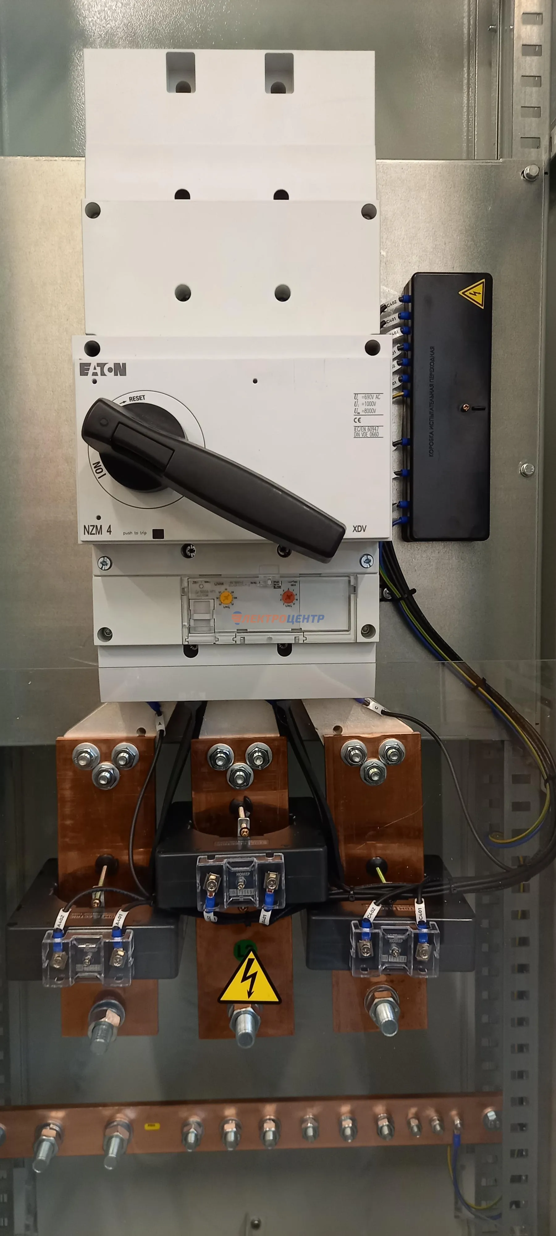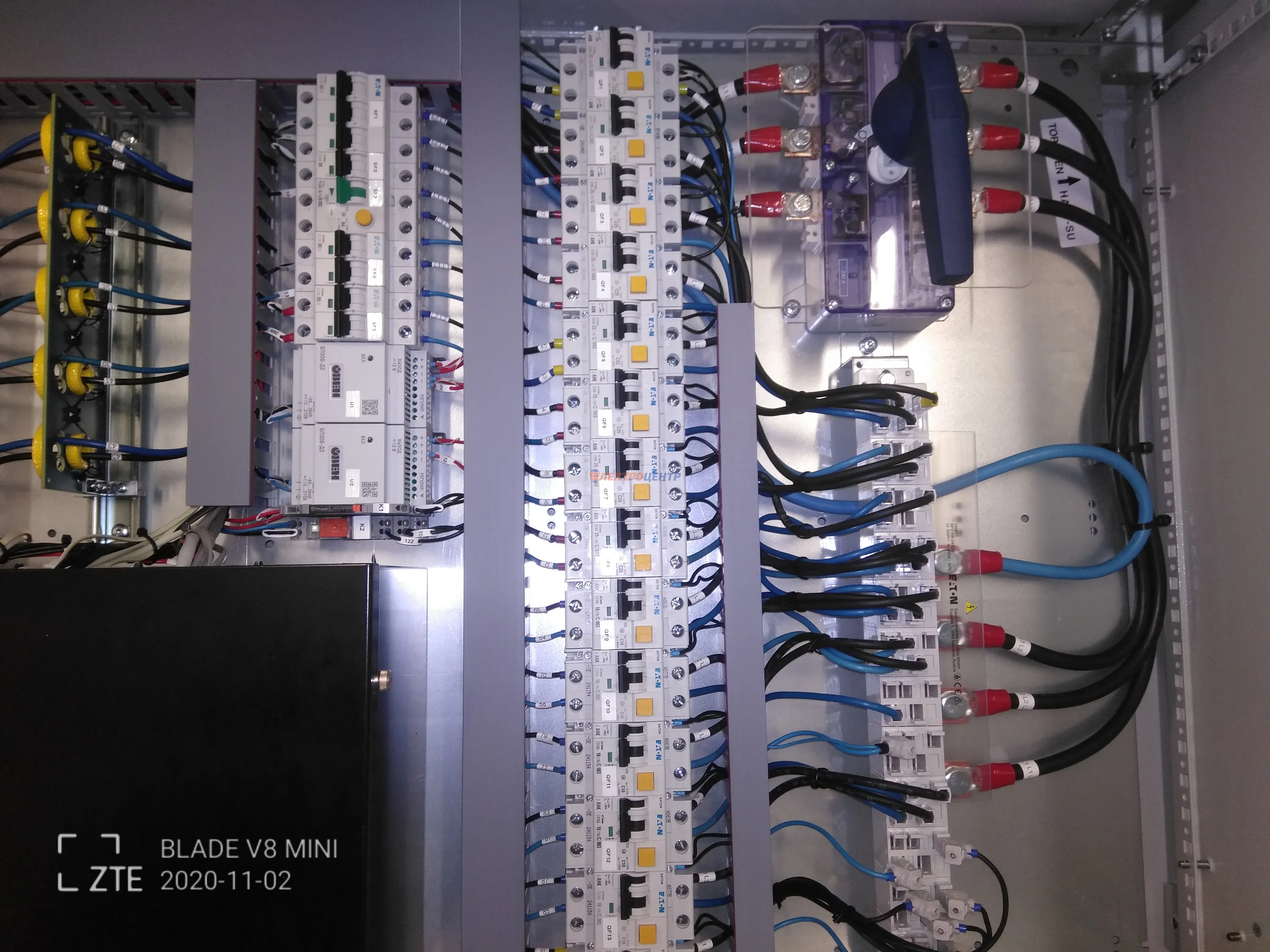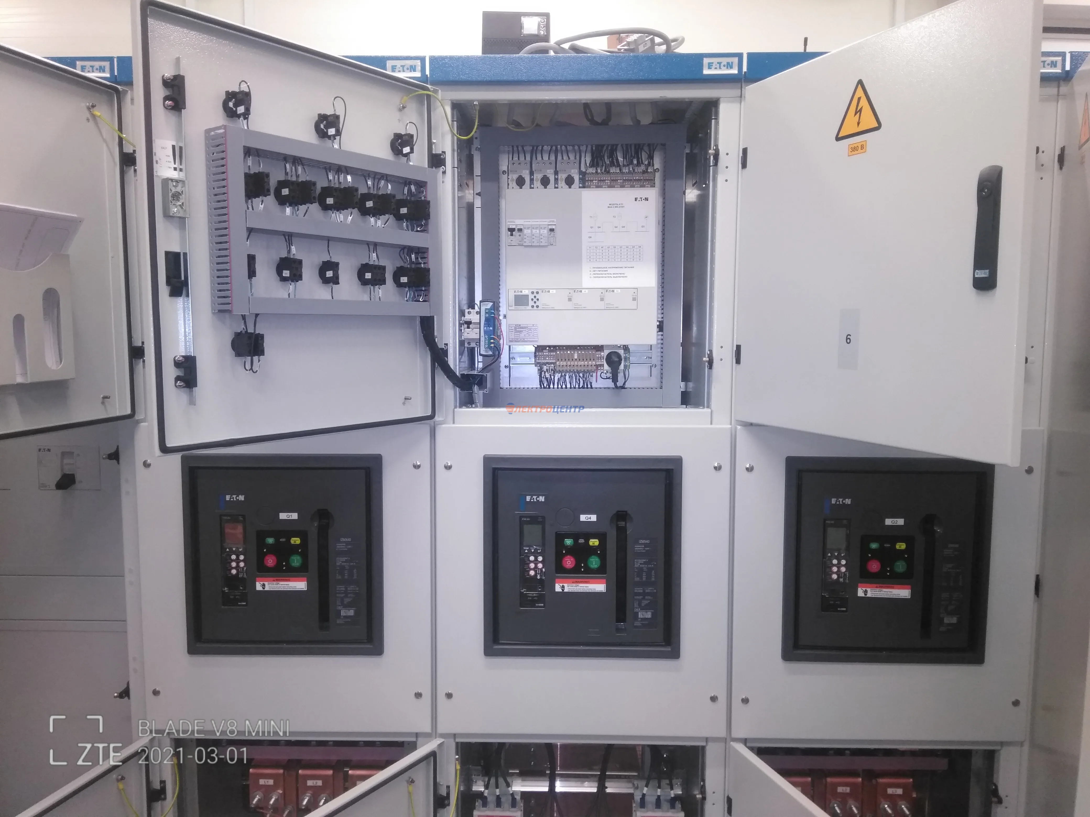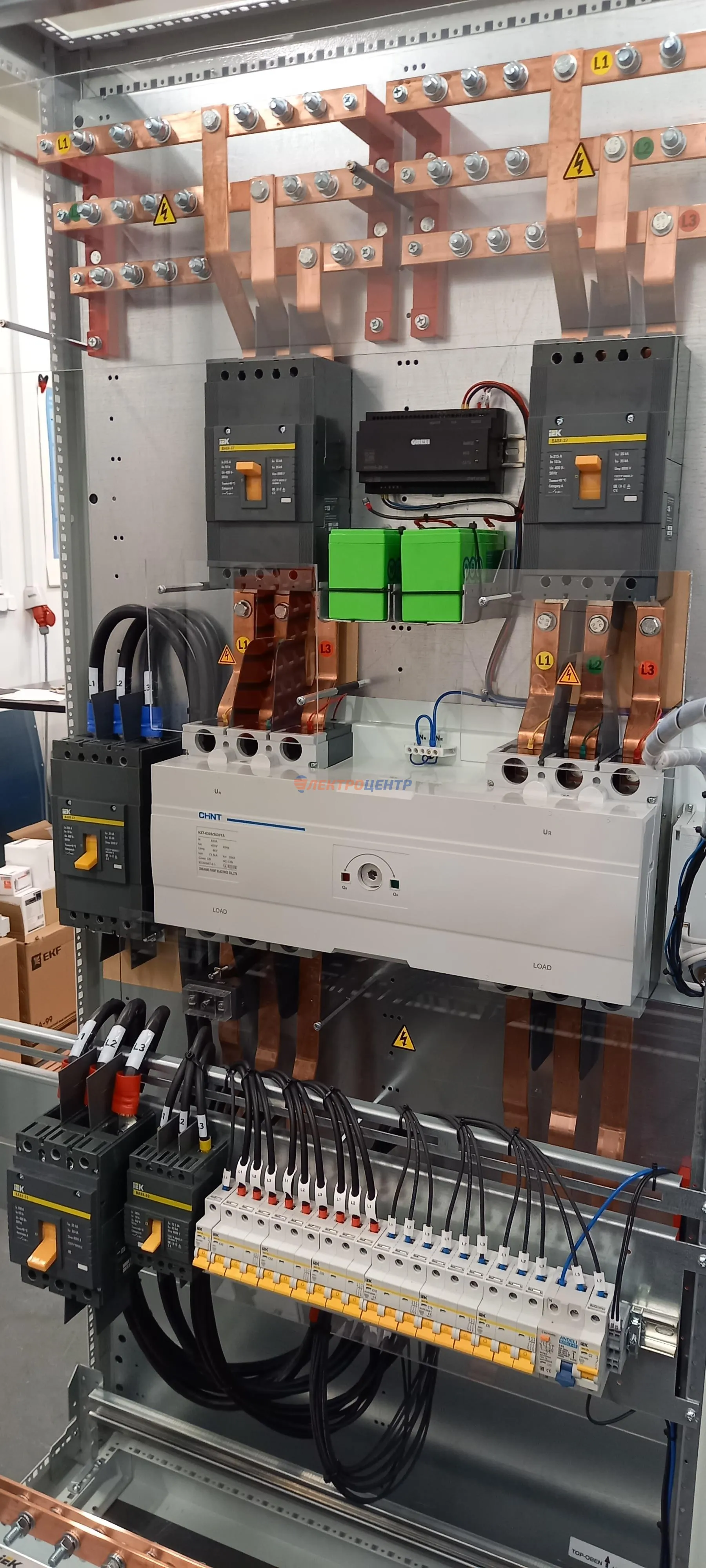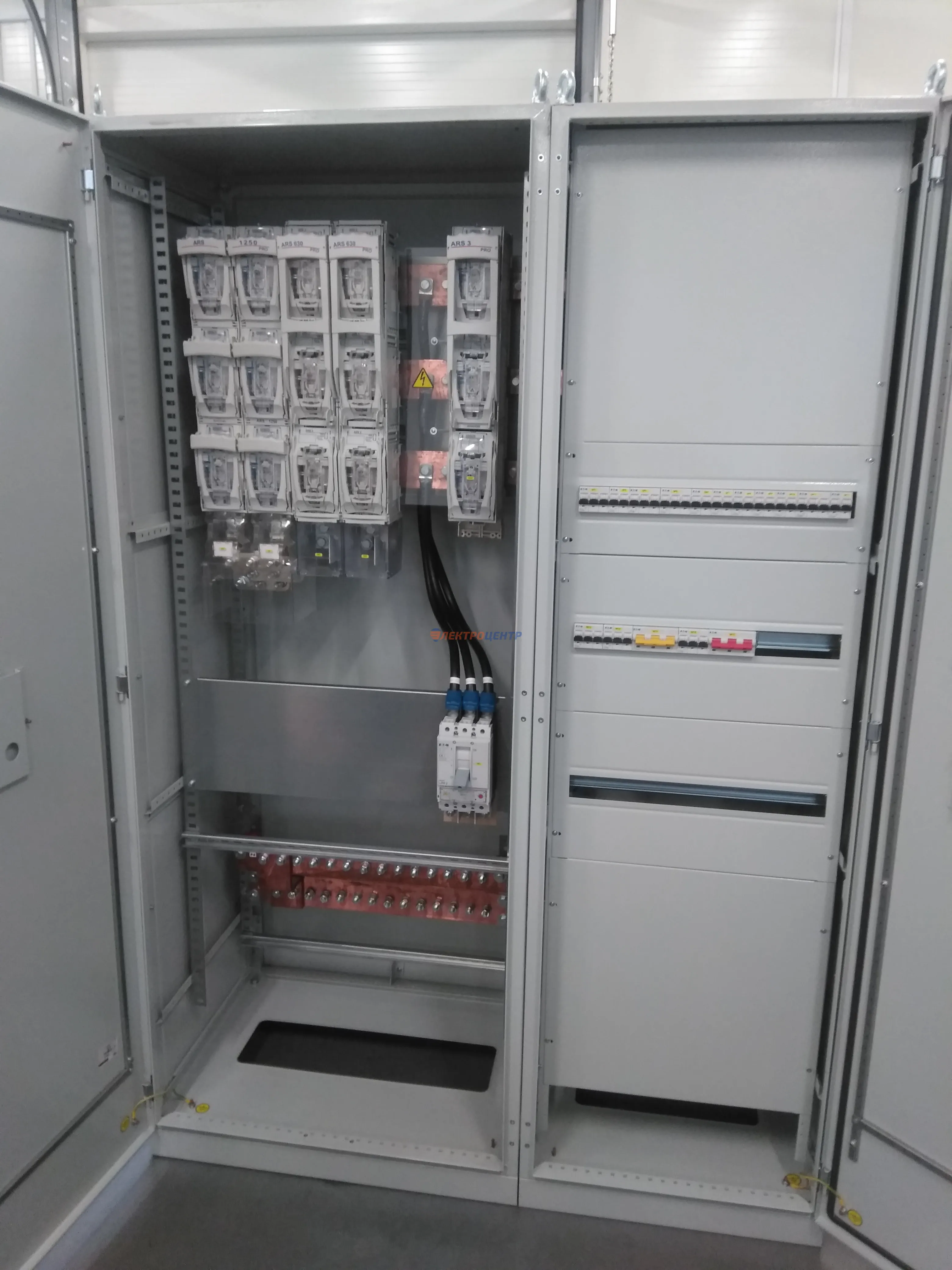 | 47 | ВРУ на 2500 А торгового центра в г. Калининград | «EATON”, “ETI”, “APATOR”, счётчики энергии ЭЛЬСТЕР МЕТРОНИКА, трансформаторы «FRER”, АВР типа MAX-3 «EATON” на 6 выключателей (изменённая схема согласно требованию заказчика). Вводные выключатели типа IZMX40, NZMN4. Оболочка типа “xENERGY” (EATON). На видео представлена проверка сработки выключателей в зависимости от присутствия напряжения на вводах. | Посмотреть фото |