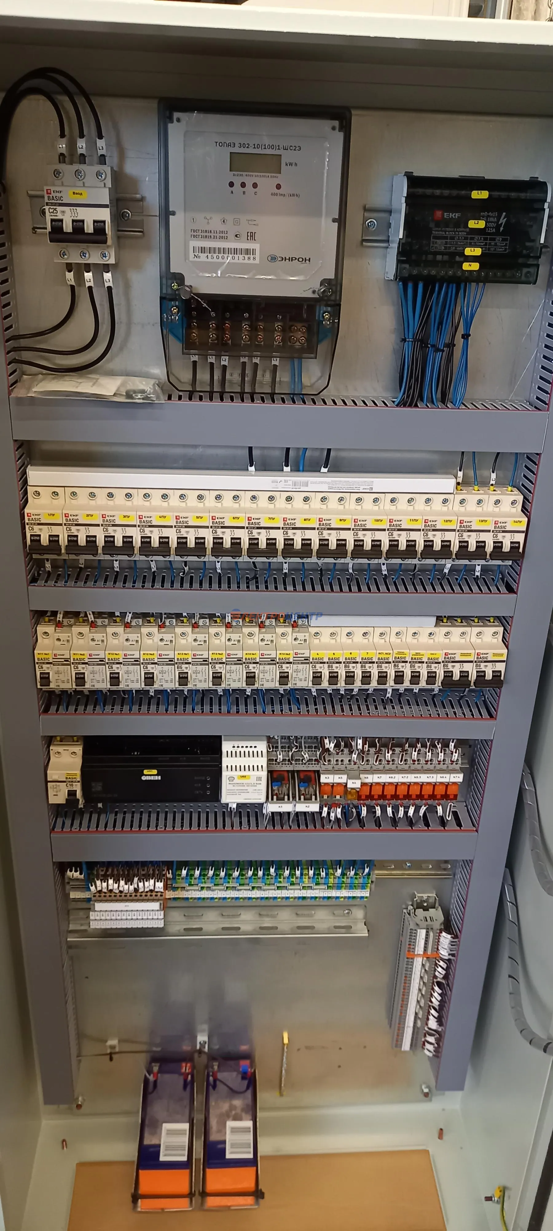 | 4 | ВРУ с АВР(250А)многоквартирного дома | оболочка- ВРУ-1ТИТАН (ИЭК), вводные выключатели с приводами EKF, модульное оборудование ИЭК, счетчик НЕВА303, контроллер АВР F&F AVR-01-S . | Посмотреть фото |