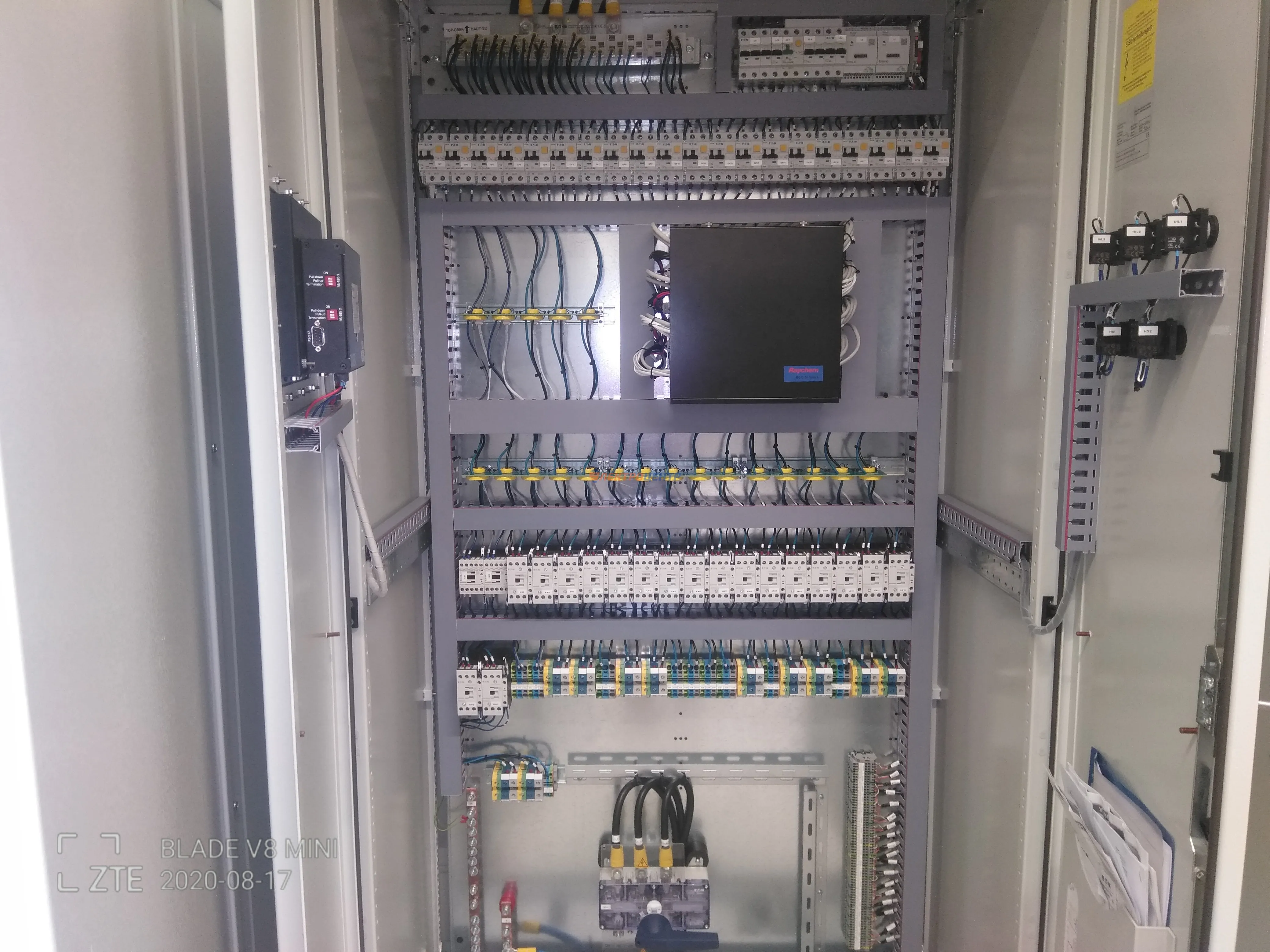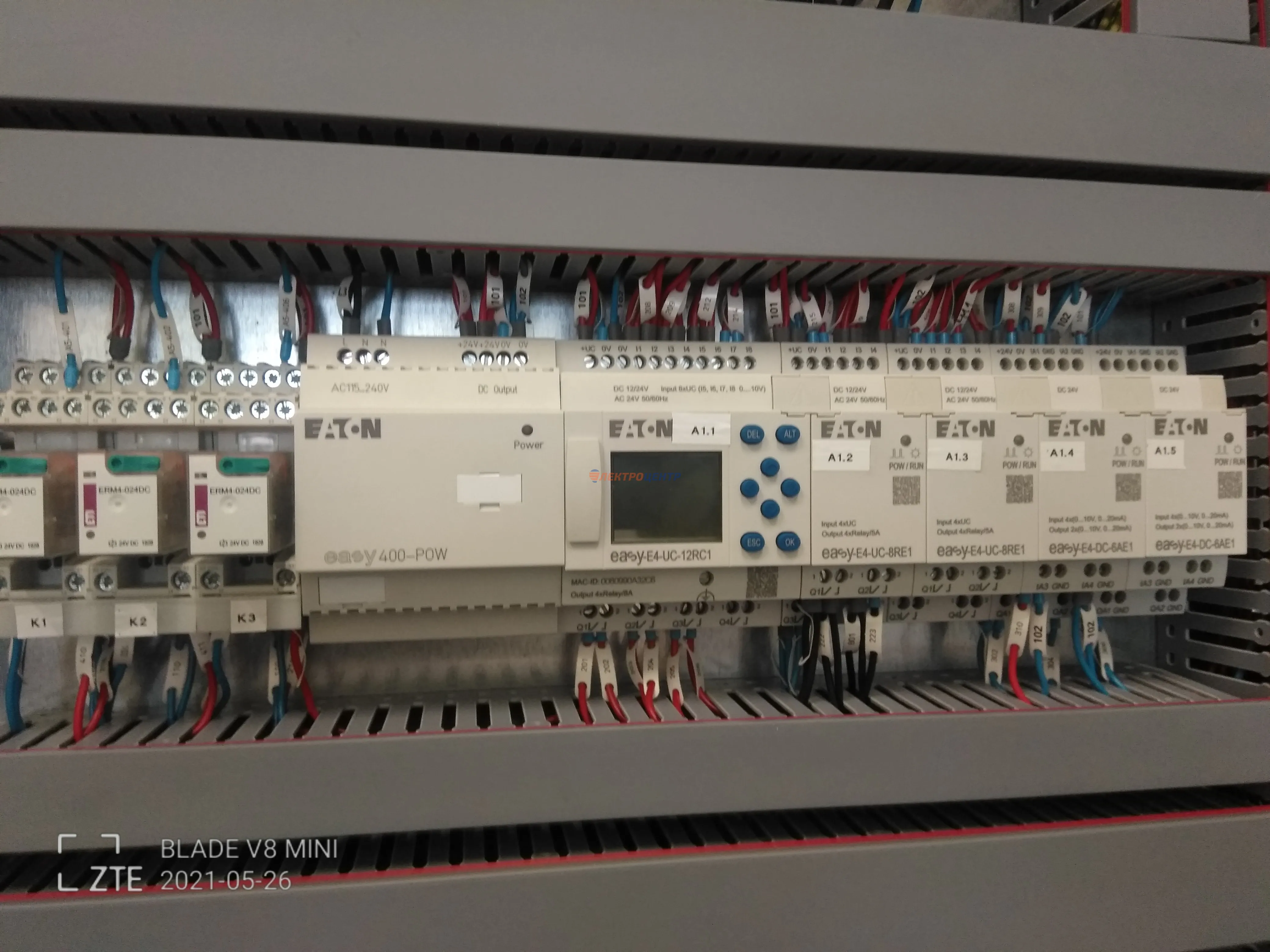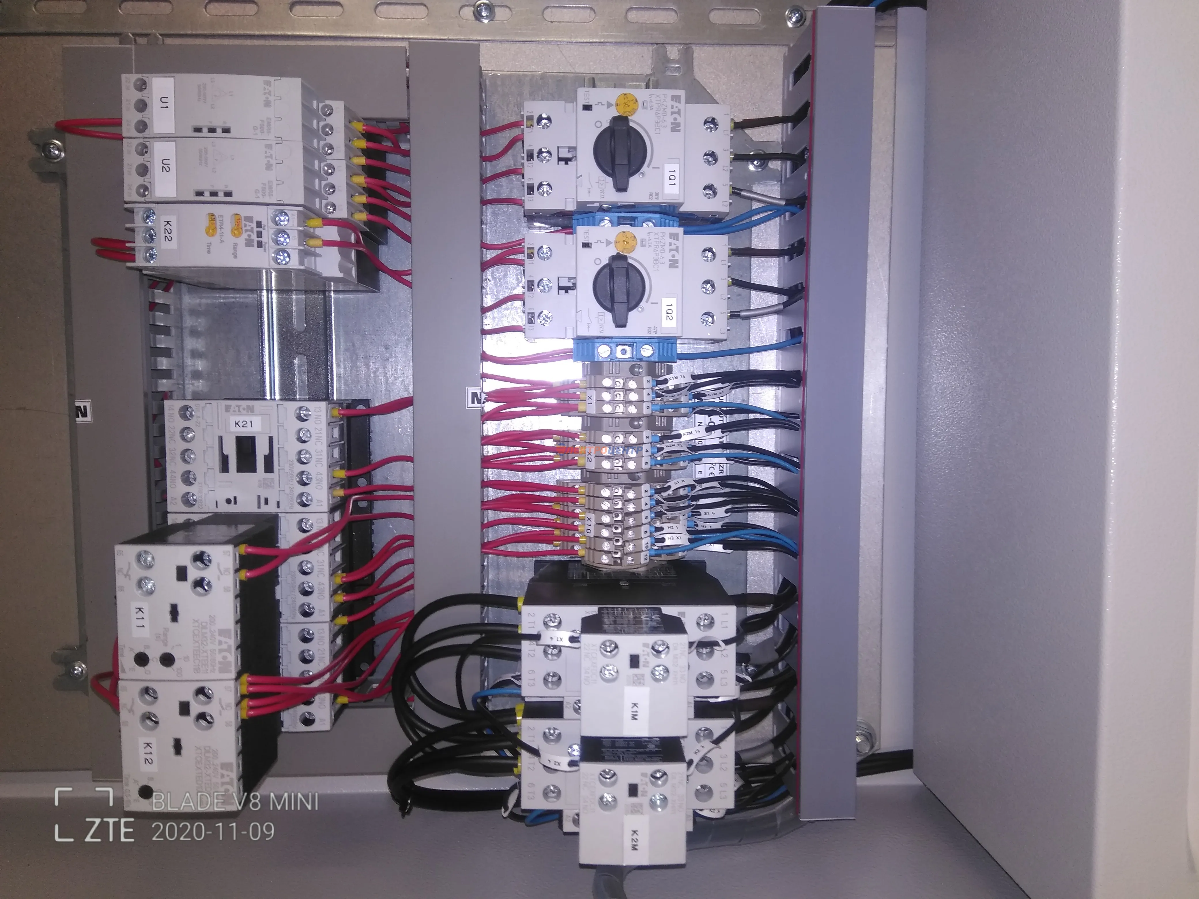 | 50 | Щит силовой автоматизации котельной | Щит силовой автоматизации котельной на базе логических реле EASY E4, позволяющих управлять и контролировать технологические процессы в котельной (регулирование скорости вращения двигателей сетевых насосов по давлению в трубопроводе с помощью преобразователей частоты; автоматическое закрытие электромагнитного клапана на газопроводе/топливопроводе при отключении электроэнергии, при превышении содержании угарного газа, метана и поступления сигнала от прибора пожарно-охранной сигнализации; регулирование температуры сетевой воды в систему отопления в зависимости от температуры наружного воздуха; светозвуковая сигнализация о нарушениях параметров работы(неисправность оборудования, повышение концентрации угарного газа и метана, понижение давления обратной сетевой воды, повышение/понижение давления газа и тд.. Оборудование: Автоматические выключатели типа LZMC, PL, PFL7, частотные преобразователи типа DC1(EATON). Оболочка: BPM-F-1000/17-P (EATON). | Посмотреть фото |